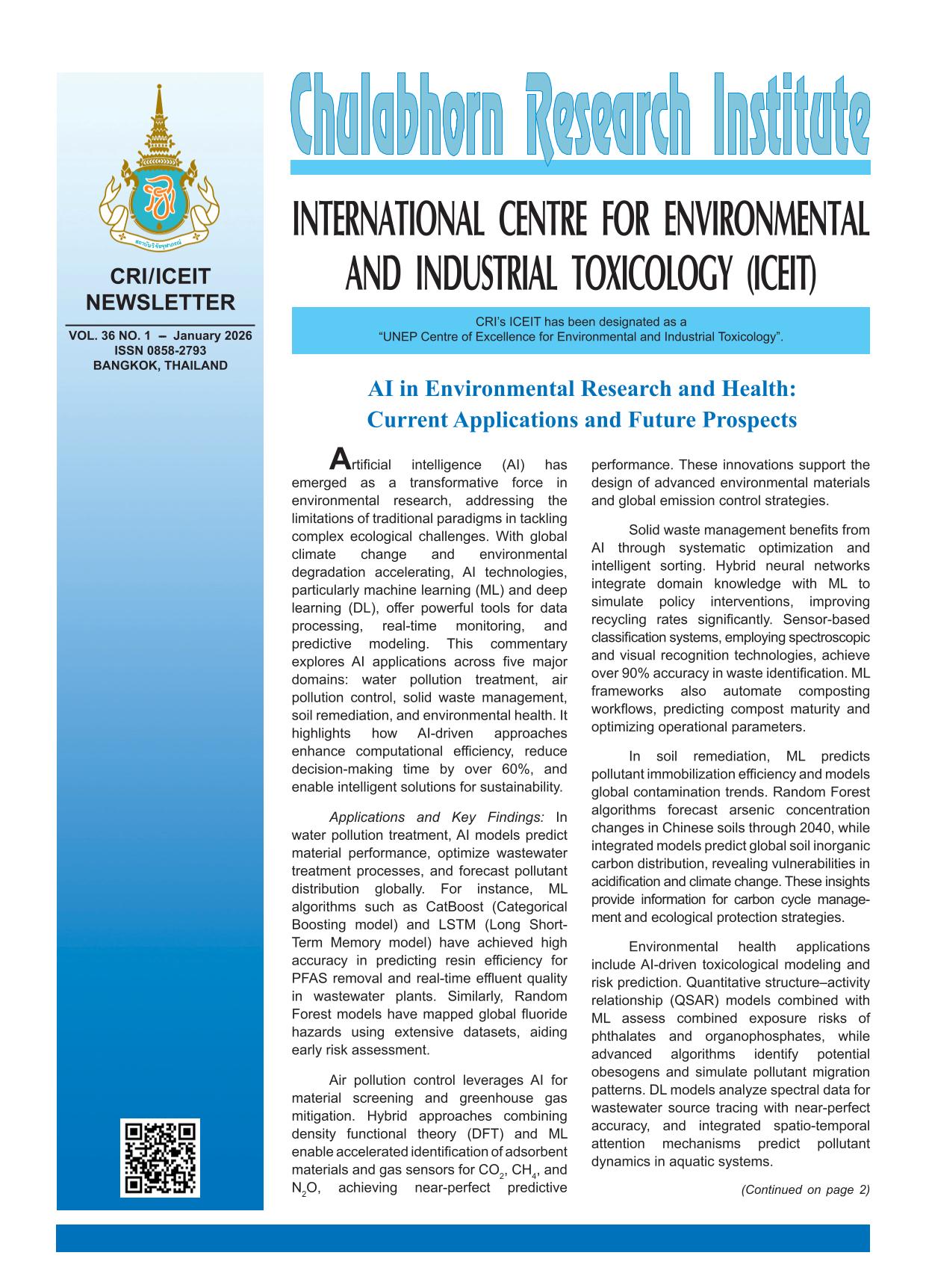 By Royal Permission of Professor Dr. Her Royal Highness Princess Chulabhorn Mahidol, July 4– Her Royal Highness’s Birthday Anniversary – has been designated as Thai Environmental Health Day. On July 4, 2025, Dr. Poonsakdi Ploypradith, Assistant Director and Expert Scientist, Office of Research, Chulabhorn Research Institute (CRI), represented the CRI at the opening ceremony of Thai Environmental Health Day. This year, the Department of Health, Ministry of Public Health, organized the event under the theme “Environmental Health for Healthy Lifestyles and Sustainable Well-Being”. The event aimed to encourage network organizations among public, the private, and community sectors, to recognize the importance of cooperation in environmental health based on the application of appropriate technologies and innovations. These efforts seek to prevent and reduce any potential impacts of rapid environmental changes on people’s livelihood, ultimately contributing to the long-term goal of sustainable development of environmental health. As part of the event, Dr. Punyawee Dulyayangkul, Miss Thitima Srathongneam, and Miss Suleepon Poomchuchit, representing researchers from the CRI’s Laboratory of Biotechnology, organized an exhibition showcasing ongoing research projects conducted by the Laboratory to address antimicrobial resistance issues in a sustainable manner. Their research work includes studies on the mechanisms and contributing factors of antimicrobial resistance, studies and development of indicators for identifying pollutant-contaminated water, and the management of antibiotics and toxic substances in water...