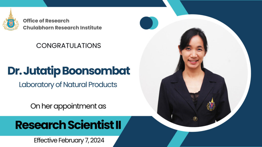 Office of Research, Chulabhorn Research Institute extends its congratulations to Miss Khajeelak Chiablaem on her appointment to the academic position as Research Scientist I, Laboratory of Biochemistry, effective April 26, 2024. Office of Research May 28, 2024