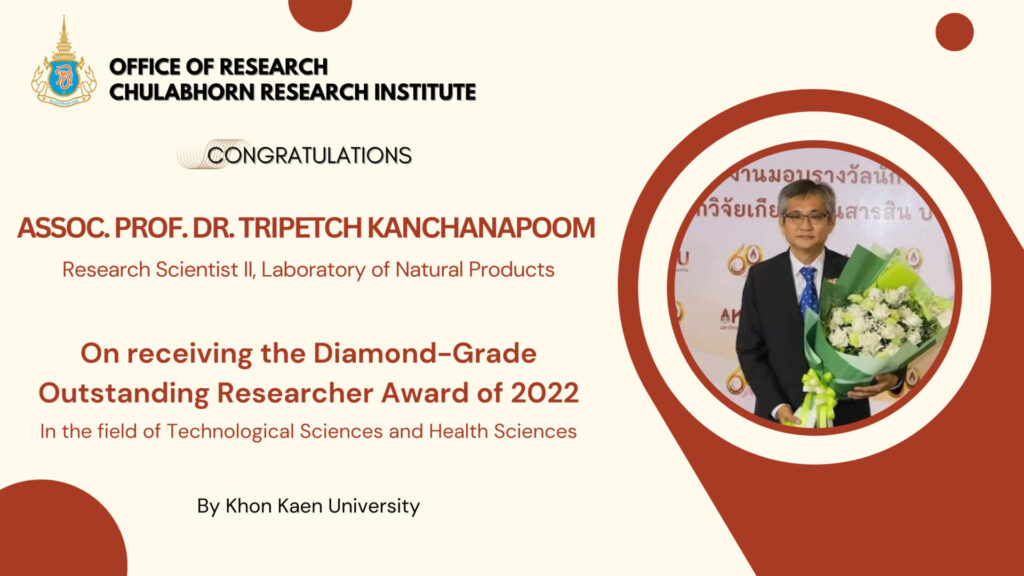 Assoc. Prof. Dr. Tripetch Kanchanapoom, Seconded Official, Research Scientist II, Laboratory of Natural Products, Chulabhorn Research Institute, and Lecturer, Department of Pharmacology and Toxicology, Khon Kaen University received the Diamond-Grade Outstanding Researcher Award of 2022 in the Field of Technological Sciences and Health Sciences from Assoc. Prof. Charnchai Panthongviriyakul, M.D., President of Khon Kaen University, in the awards ceremony for outstanding researchers and Sarasin honorary researchers of 2022, on September 22, 2023 at Convention Hall, Avani Khon Kaen Hotel & Convention Centre. Khon Kaen University honors and bestows these awards to scientists with remarkable research and publications in leading international journals. Office of Research, Chulabhorn Research Institute extends its congratulations on this occasion. Office of Research January 16, 2024