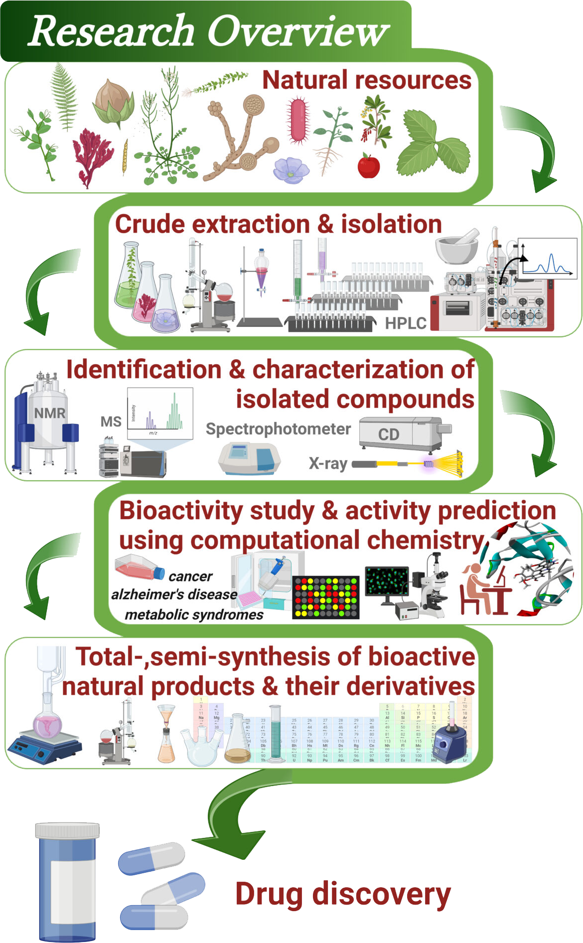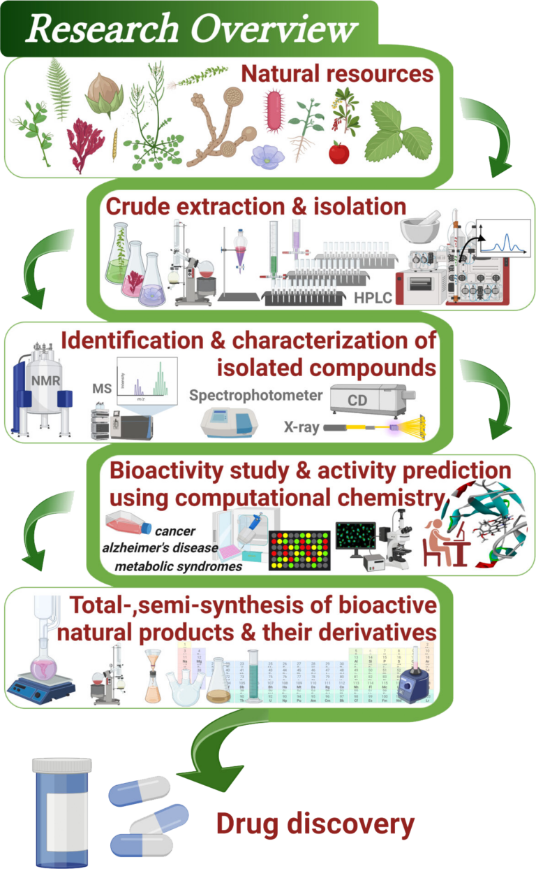 As natural products continue to play a major role in drug discovery, especially at the early stage, our laboratory has focused on advancing the frontier which would ultimately lead to the discovery of natural products with novel skeletons, endless potential, and uncharted utilization. Despite traditional clinical use, the composition in herbal medicines has not been clearly identified. This has prompted our team to undertake systematic chemotaxonomic approach to elucidate the structures of bioactive compounds, some of which have warranted further investigations and development into drug-like candidates for their direct use or templates for structural modifications.