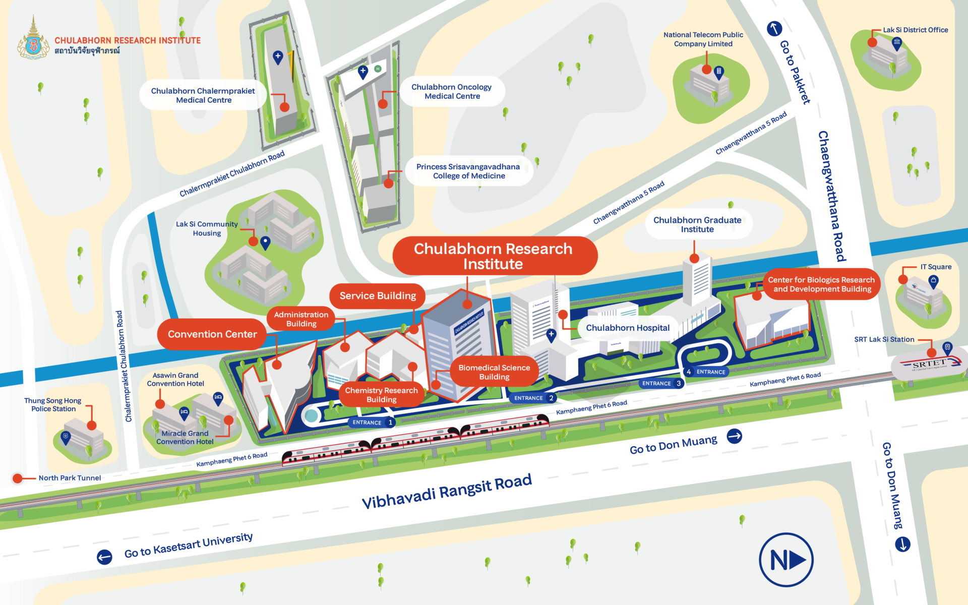Chulabhorn Research Institute is located on the Kamphaeng Phet 6 Road, next to the Miracle Grand Hotel.