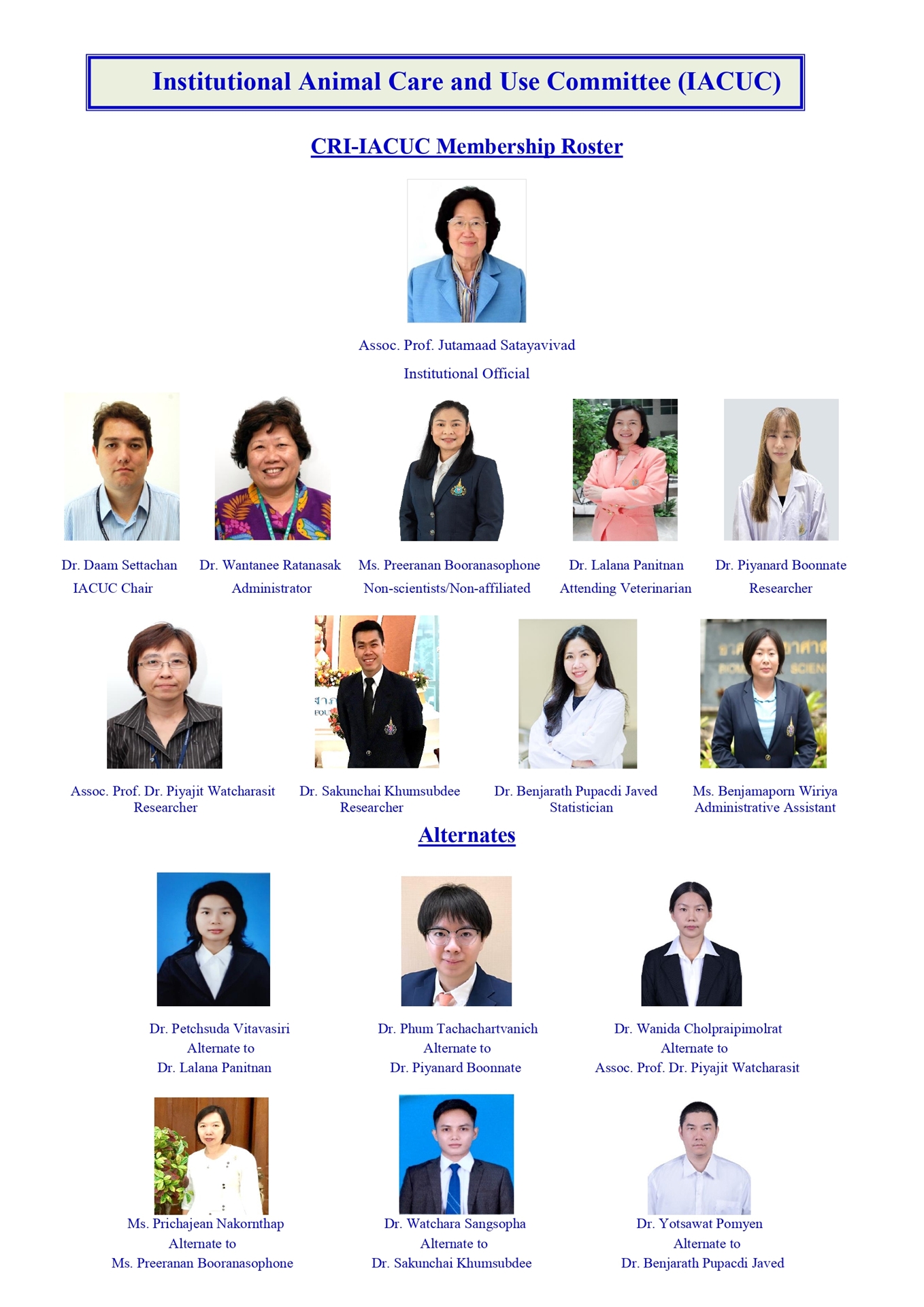 CRI’s Institute Animal Care and Use Committee (IACUC) is the oversight body for monitoring and enforcing all animal care and use activities in accordance with CRI’s Animal Care and Use Program (ACUP), policies and standard operating procedures, as well as principles and guidelines in Animals for Scientific Purposes Act, Guide for the Care and Use of Laboratory Animals, 8th ed. (US National Research Council) and the Ethical Principles and Guidelines for the Use of Animals for Scientific Purposes (National Research Council of Thailand).