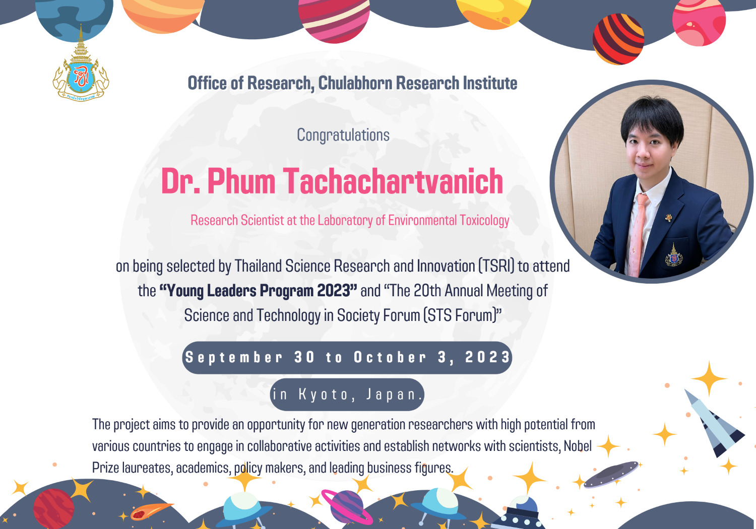 The Office of Research, Chulabhorn Research Institute (CRI), congratulates Dr. Phum Tachachartvanich, Research Scientist at the Laboratory of Environmental Toxicology, CRI, on being selected by Thailand Science Research and Innovation (TSRI) to attend the “Young Leaders Program 2023” and “The 20th Annual Meeting of Science and Technology in Society Forum (STS Forum)” from September 30 to October 3, 2023 in Kyoto, Japan.