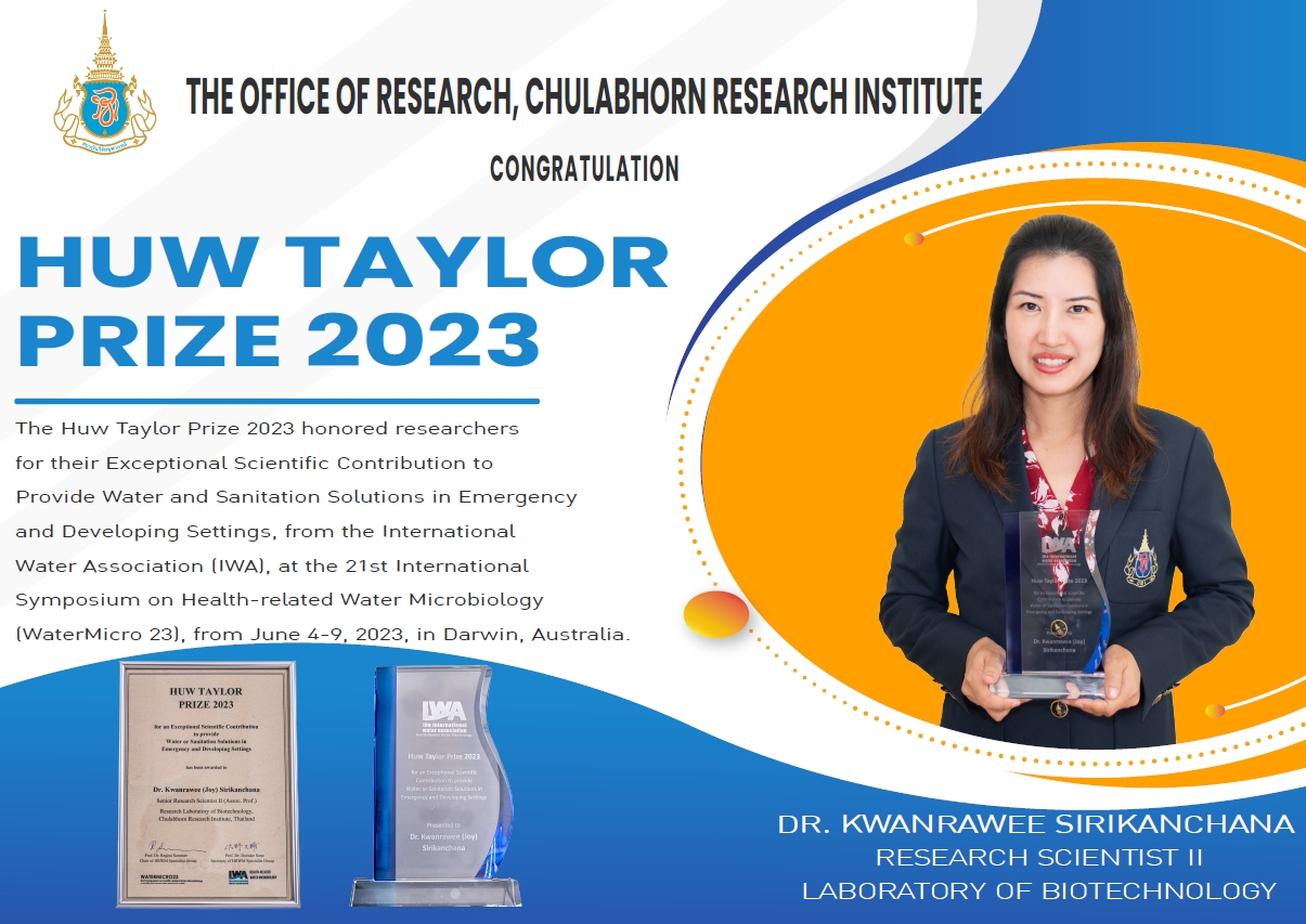 Dr. Kwanrawee Sirikanchana, Research Scientist II at the Laboratory of Biotechnology, Chulabhorn Research Institute, was nominated to be awarded the prestigious Huw Taylor Prize 2023 from the International Water Association (IWA), United Kingdom. The 2023 IWA-HRM Huw Taylor Prize recognizes researchers for their Exceptional Scientific Contribution to Provide Water and Sanitation Solutions in Emergency and Developing Settings. The award presentation ceremony was held at the 21st International Symposium on Health-related Water Microbiology (WaterMicro 23), organized by the Health-related Water Microbiology (HRWM) Specialist Group, IWA, from June 4 – 9, 2023, in Darwin, Australia.