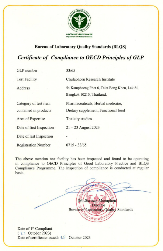 The Chulabhorn Research Institute was certified for laboratory standards in compliance with the OECD Principles of GLP from the Bureau of Laboratory Quality Standards, Department of Medical Sciences, Ministry of Public Health, on October 25, 2023.