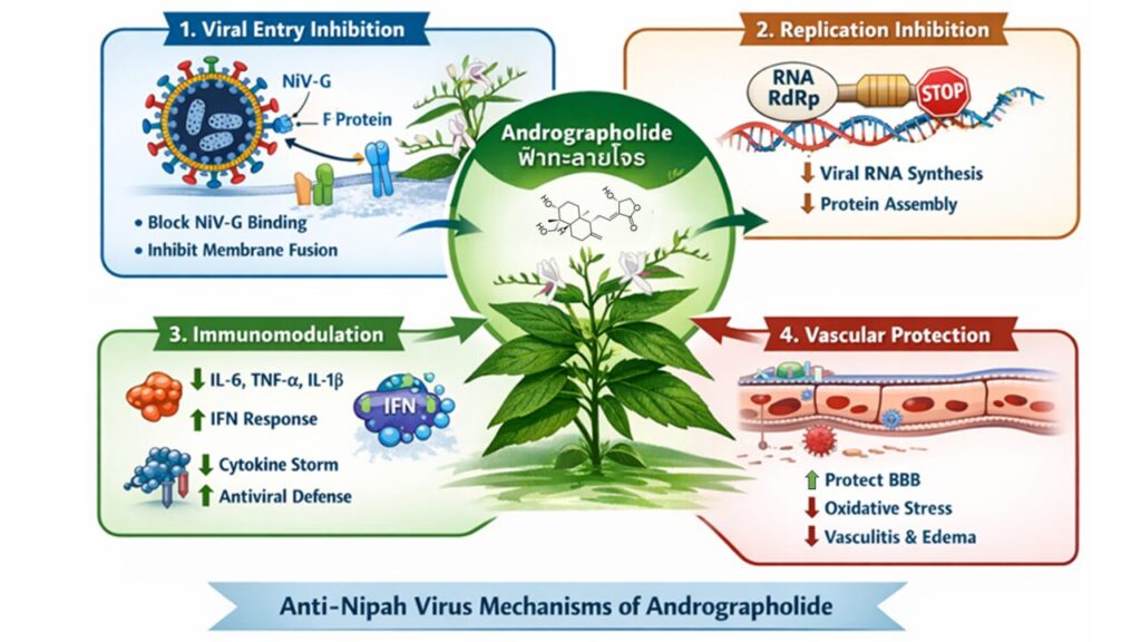 ดร.สุทธิพงษ์ ชูจันทร์, รศ.ดร.ภญ.จุฑามาศ สัตยวิวัฒน์ ห้องปฏิบัติการวิจัยเภสัชวิทยา สถาบันวิจัยจุฬาภรณ์ ไวรัสนิปาห์ (Nipah virus) เป็นไวรัสในสกุล Henipavirus วงศ์ Paramyxoviridae ติดต่อจากสัตว์สู่คน ซึ่งมีค้างคาวผลไม้เป็...