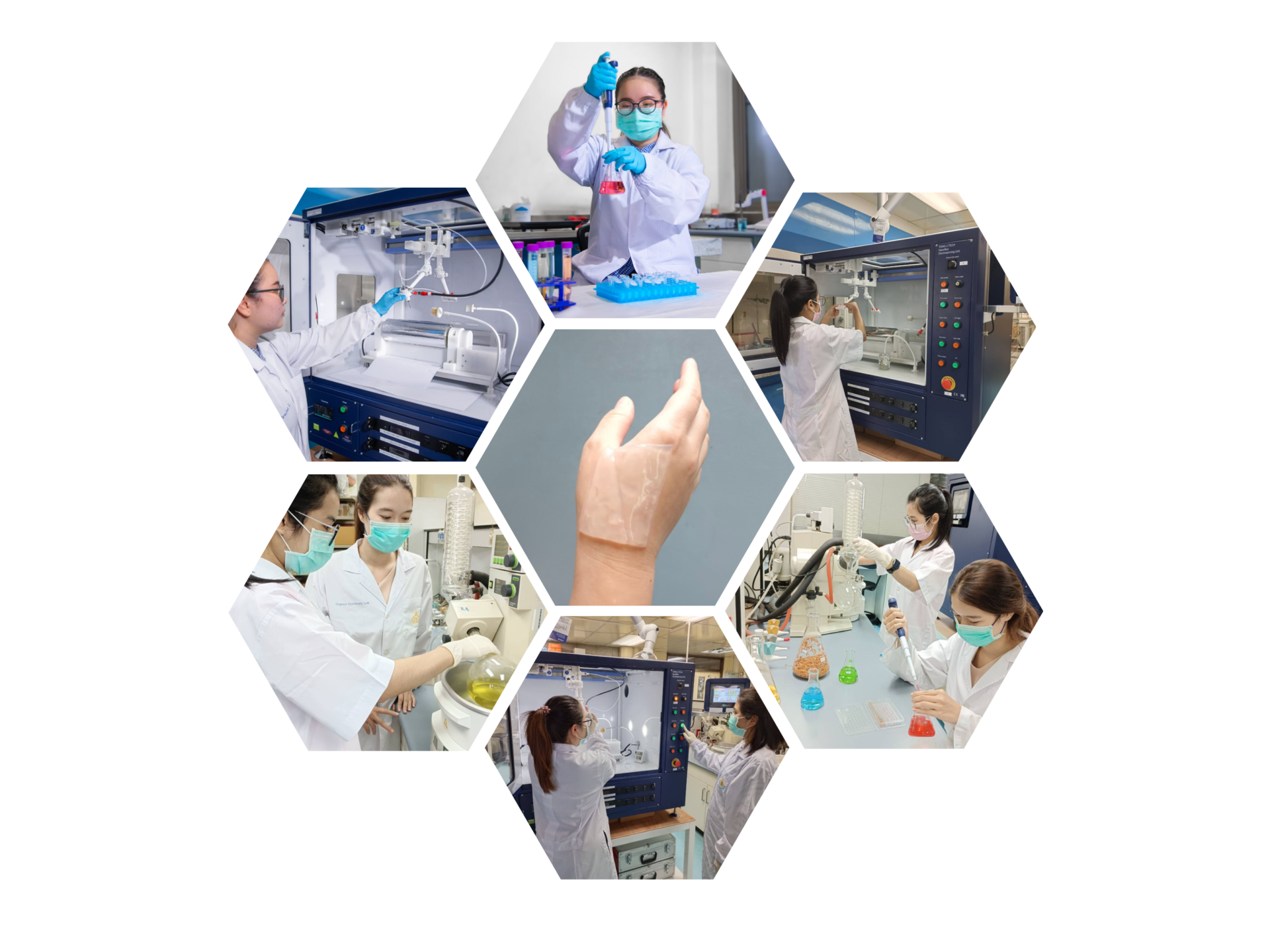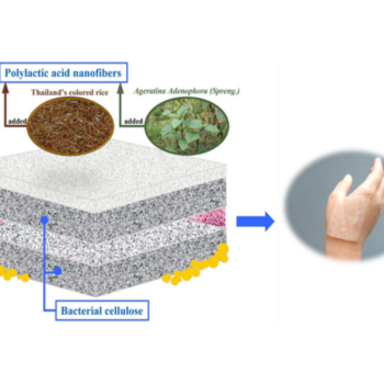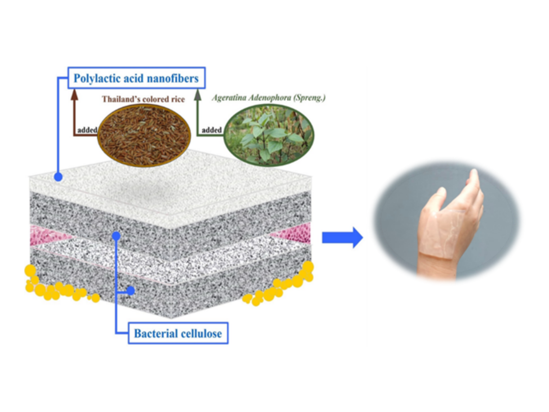 ตัวอย่างงานวิจัยด้านการประยุกต์ใช้ ได้แก่ การพัฒนาผลิตภัณฑ์จากสารสกัดและน้ำมันหอมระเหยจากพืชสมุนไพร เช่น การทำครีมฆ่าเชื้อจากเปลือกมังคุด ข่า พลู ขมิ้นขาว และมหาหงส์ งานวิจัยพัฒนาผลิตภัณฑ์วัสดุทางการแพทย์ เพื่อต่อยอดสู่การผลิตเชิงพาณิชย์ภายในประเทศ เช่น การพัฒนาวัสดุปิดแผลสองชั้น (double layer-wound dressing) จากพอลิเมอร์ชีวภาพ (Biopolymer) ที่ผสมสารสกัดจากสมุนไพรไทย โดยชั้นที่ 1 เป็นแผ่นแบคทีเรียเซลลูโลสที่เลี้ยงด้วยน้ำมะพร้าวที่ช่วยคงความชุ่มชื้นแก่แผล ง่ายต่อการลอกออก ช่วยซับสารคัดหลั่งจากบาดแผล และชั้นที่ 2 เป็นเส้นใยนาโนโพลิแลคติกแอซิดที่ขึ้นรูปด้วยเทคนิคอิเล็กโตรสปิน (electrospinning process) ผสมสารสกัดจากข้าวและน้ำมันหอมระเหยจากสาบหมา (รูปที่ 1) โดยสารสกัดจากข้าวมีคุณสมบัติต้านอนุมูลอิสระและน้ำมันหอมระเหยจากสาบหมามีฤทธิ์ในการยับยั้งเชื้อแบคทีเรีย และจากการศึกษาความเป็นพิษต่อเซลล์ผิวหนังของมนุษย์ พบว่าวัสดุปิดแผลสองชั้นที่ผสมสารสกัดข้าวและน้ำมันหอมระเหยไม่เป็นพิษต่อเซลล์ Human Dermal Fibroblasts และเซลล์ human keratinocyte (HaCaT) งานวิจัยดังกล่าวจึงเป็นการพัฒนาวัสดุปิดแผลที่มีประสิทธิภาพขึ้นใช้เองภายในประเทศ ลดการนำเข้าจากต่างประเทศ สามารถรองรับการรักษาผู้ป่วยได้อย่างเพียงพอและมีประสิทธิภาพ