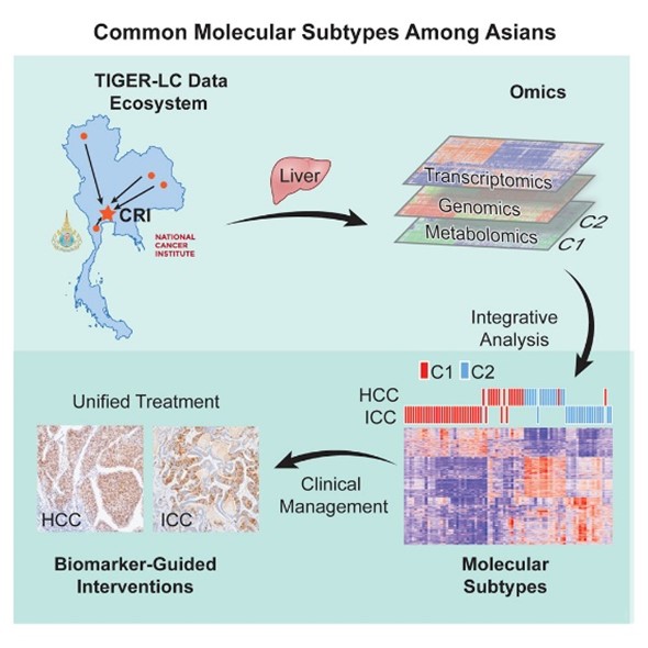 นักวิจัยของสถาบันฯ ได้ทำการวิเคราะห์ลักษณะของมะเร็งตับในระดับชีวโมเลกุล โดยการนำชิ้นเนื้อมะเร็งและส่วนที่ไม่เป็นมะเร็งของผู้ป่วยจำนวน 200 ราย ไปวิเคราะห์ด้วยเทคโนโลยีที่สามารถให้ข้อมูลเชิงลึกของกลไกระดับโมเลกุลภายในเซลล์มะเร็ง จากการวิเคราะห์พบว่า มะเร็งชนิดเซลล์ตับและมะเร็งท่อน้ำดีของผู้ป่วยไทย สามารถแบ่งออกเป็นกลุ่มย่อยได้อีกตามลักษณะความแตกต่างในระดับชีวโมเลกุล ซึ่งมีความสัมพันธ์กับอัตราการรอดชีวิตของผู้ป่วย นอกจากนี้ยังได้ค้นพบกลุ่มย่อยที่มีลักษณะเฉพาะของผู้ป่วยไทยและคนเอเชียชาติอื่น ๆ แต่ไม่พบในคนยุโรป แสดงให้เห็นว่ามะเร็งตับของแต่ละเชื้อชาติมีความแตกต่างกัน ซึ่งอาจตอบสนองต่อการรักษาต่างกันไปด้วย (Chaisaingmongkol et al., 2017)