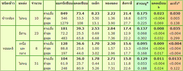 b ค่ามาตรฐานสูงสุดของแคดเมียมในข้าวที่กำหนดโดย European Communities = 0.2 มก./กก.; Food Standard Australia-New Zealand = 0.1 มก./กก.