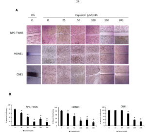 นักวิจัยของห้องปฏิบัติการวิจัยการเกิดมะเร็งจากสารเคมีได้ทำการศึกษาและอธิบายกลไกของสารแคปไซซินในการยับยั้งการแพร่กระจายของเซลล์มะเร็งหลังโพรงจมูก 3 ชนิด ได้แก่ เซลล์ HONE1, CNE1 และ NPC-TW06 ที่มีลักษณะจำเพาะแตกต่างกัน โดยทดสอบผลของสารแคปไซซินต่อความเป็นพิษต่อเซลล์ (cell cytotoxicity) การเพิ่มจำนวนของเซลล์ (cell proliferation) การจำลองการสมานแผล (wound healing) การลุกลามและการเคลื่อนที่ของเซลล์ (invasion และ migration) พบว่าสารแคปไซซิน ในช่วงความเข้มข้น 25-150 ไมโครโมลาร์ สามารถยับยั้งการแบ่งตัวและการลุกลามของเซลล์มะเร็งหลังโพรงจมูกทั้งสามชนิดได้ดี และเมื่อเซลล์ได้รับสารแคปไซซินมากกว่า 200 ไมโครโมลาร์ขึ้นไปพบว่าเซลล์มีรูปร่างที่เปลี่ยนไป และเข้าสู่กระบวนการตายแบบอะพอพโทซิส