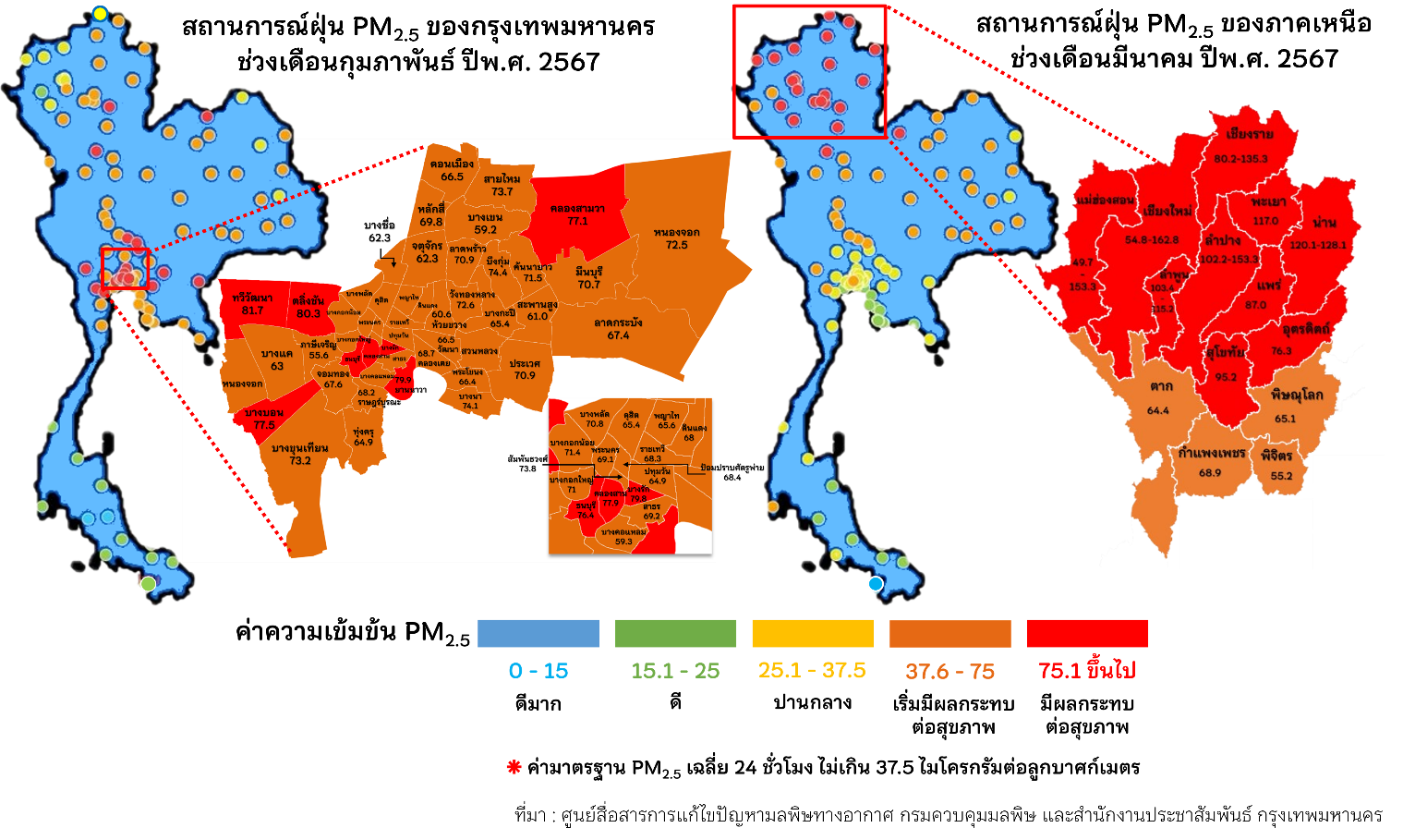 สถานการณ์ฝุ่น PM2.5 ในประเทศไทยเพิ่มสูงขึ้นในช่วงเดือนธันวาคม-มีนาคมของทุกปี จากข้อมูลคุณภาพอากาศ กรมควบคุมมลพิษ พบว่าสถานการณ์ฝุ่น PM2.5 ในอากาศของกรุงเทพมหานครเพิ่มสูงขึ้นในช่วงเดือนมกราคม-กุมภาพันธ์ ในปี 2567 ระดับฝุ่น PM2.5 อยู่ในระดับเริ่มมีผลกระทบต่อสุขภาพของประชาชนตั้งแต่เดือนมกราคม (22.7-66.1 ไมโครกรัมต่อลูกบาศก์เมตร) และมีผลกระทบต่อสุขภาพในเดือนกุมภาพันธ์ (35.5-87.1 ไมโครกรัมต่อลูกบาศก์เมตร) ขณะที่สถานการณ์ฝุ่น PM2.5 ในอากาศของภาคเหนือจะเพิ่มสูงขึ้นในช่วงเดือนกุมภาพันธ์-มีนาคม ระดับฝุ่น PM2.5 ในอากาศส่วนใหญ่อยู่ในระดับเริ่มมีผลกระทบต่อสุขภาพในเดือนกุมภาพันธ์ (18.6-92.2 ไมโครกรัมต่อลูกบาศก์เมตร) และมีผลกระทบต่อสุขภาพในเดือนมีนาคม (47.4-158.7 ไมโครกรัมต่อลูกบาศก์เมตร)