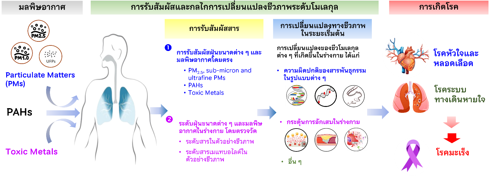 งานวิจัยเกี่ยวกับผลกระทบต่อสุขภาพจากการได้รับฝุ่น PM2.5 และฝุ่นขนาดต่าง ๆ