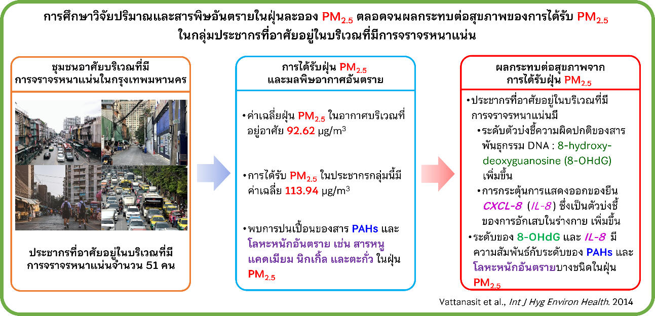ในปีพ.ศ. 2557 สถาบันวิจัยจุฬาภรณ์ได้ตีพิมพ์ผลงานวิจัยในวารสารนานาชาติที่ศึกษาวิจัยปริมาณและสารพิษอันตรายในฝุ่นละออง PM2.5 ตลอดจนผลกระทบของการได้รับ PM2.5 ในกลุ่มประชากรที่อาศัยอยู่ในบริเวณที่มีการจราจรหนาแน่นของกรุงเทพมหานคร