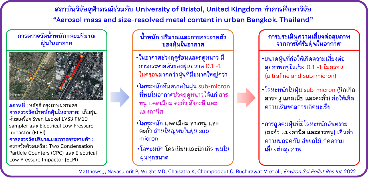 นอกจากนี้ สถาบันวิจัยจุฬาภรณ์มีความร่วมมือทางวิชาการกับ University of Bristol สหราชอาณาจักร ทำการศึกษาวิจัยการวิเคราะห์การกระจายตัวของฝุ่นขนาดต่าง ๆ ในอากาศของกรุงเทพมหานคร รวมทั้งประเมินความเสี่ยงต่อสุขภาพจากการได้รับฝุ่นขนาดต่าง ๆ เหล่านี้ และผลงานวิจัยนี้ได้รับการตีพิมพ์ในวารสารนานาชาติ “Environmental Science and Pollution Research” ในปีพ.ศ. 2565