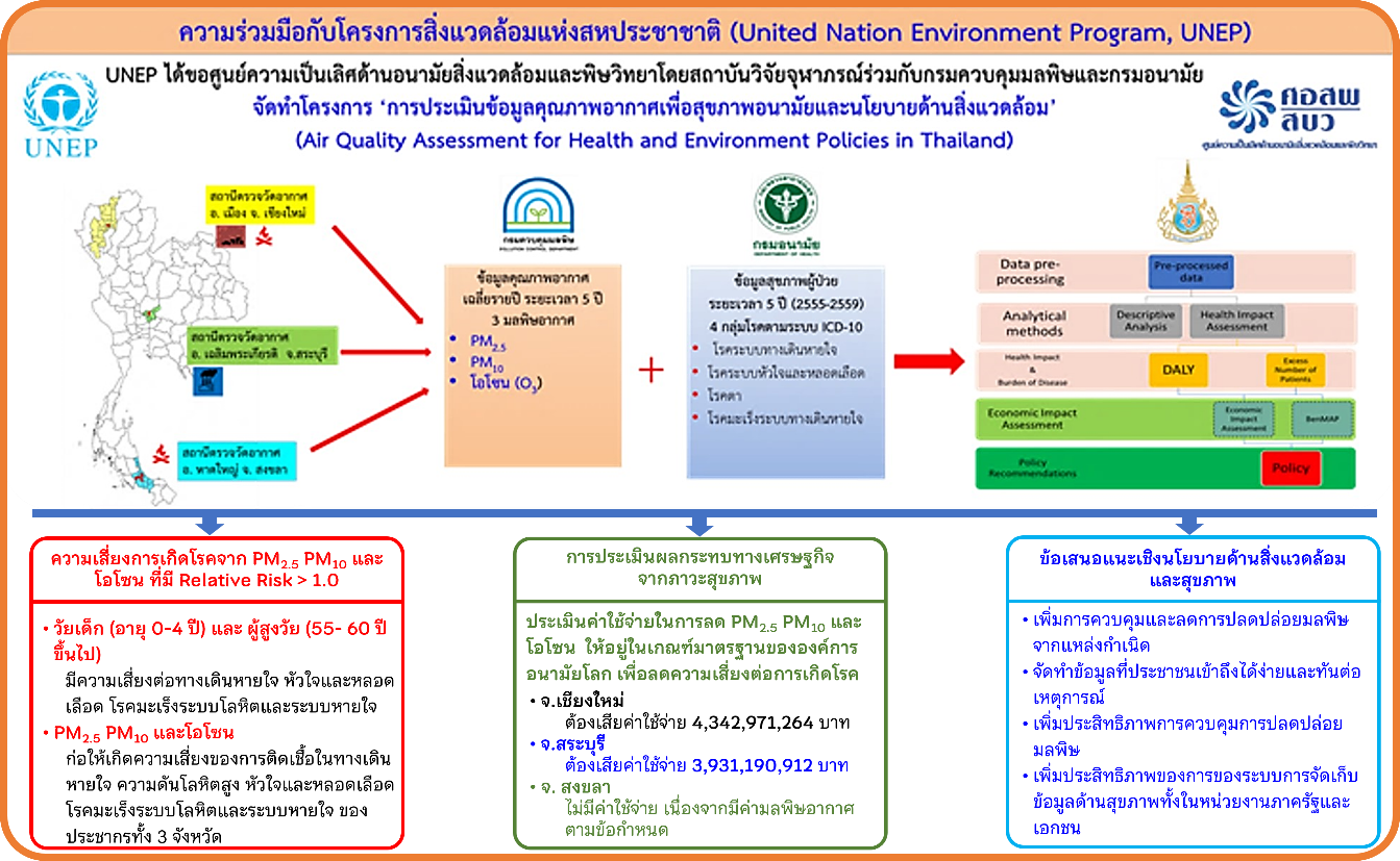 ในปีพ.ศ. 2560 ศูนย์ความเป็นเลิศด้านอนามัยสิ่งแวดล้อมและพิษวิทยา (อสพ) โดยสถาบันวิจัยจุฬาภรณ์ ร่วมกับกรมควบคุมมลพิษ กระทรวงทรัพยากรธรรมชาติและสิ่งแวดล้อม และกรมอนามัย กระทรวงสาธารณสุข จัดทำโครงการ “การประเมินผลกระทบต่อสุขภาพจากมลพิษอากาศเพื่อจัดทำข้อเสนอแนะเชิงนโยบายของประเทศไทย (Air Quality Assessment for Health and Environment Policies in Thailand)” ซึ่งเป็นโครงการที่ได้รับการสนับสนุนจากโครงการสิ่งแวดล้อมแห่งสหประชาชาติ (United Nation Environment Program: UNEP) เพื่อประเมินสถานการณ์และข้อมูลทางวิชาการประกอบการจัดทำข้อเสนอแนะเชิงนโยบายเรื่องการจัดการคุณภาพอากาศและผลกระทบต่อสุขภาพอนามัยจากการได้รับ PM2.5 PM10 และโอโซน ในประชากรในพื้นที่จังหวัดสงขลา สระบุรี และ เชียงใหม่