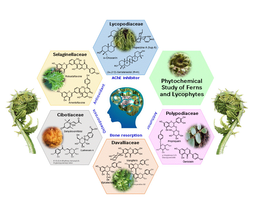 เป็นการศึกษาสารออกฤทธิ์ทางชีวภาพจากความหลากหลายทางชีวภาพของพืชตระกูลเฟิร์น (ferns) พืชคล้ายเฟิร์น (lycophytes) จากการศึกษาตามกระบวนดังกล่าวข้างต้น พบว่าสารสกัดบริสุทธิ์ที่ได้จากคลับมอส เช่นสารฮูเปอซีนเอ ซึ่งเป็นสารกลุ่มไลโคโปเดียมอัลคาลอยด์และสารกลุ่มไตรเทอร์ปีน เช่น อัลฟ่าโอโนเซอรีนและเซอราทีนบางชนิดมีฤทธิ์ในการยับยั้งเอนไซม์อะซิทิลโคลีนเอสเทอเรสที่มีผลต่อโรคสมองเสื่อม นอกจากนี้ยังพบสารกลุ่มไบฟลาโวนอยด์ เช่น อะเมนโตฟลาโวน จากพืชคล้ายเฟิร์นกนกนารี สารกลุ่มฟลาโวนอยด์ เช่น อีพิคาเทชิน และ สารแมงจิเฟอรีนจากเฟิร์นนาคราช ซึ่งพบว่ามีฤทธิ์ต้านอนุมูลอิสระ มีความเป็นพิษต่อเซลล์มะเร็งบางชนิด และยับยั้งโรคกระดูกพรุน สามารถนำไปพัฒนาเพื่อต่อยอดการศึกษาโรคกลุ่มไม่ติดต่อ (non-communicable diseases, NCDs) ได้