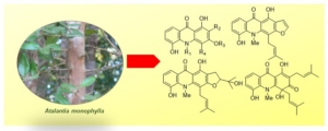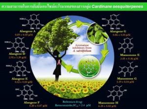 - การศึกษาองค์ประกอบทางเคมีของต้นปรู๋ (Alangium salviifolium) ซึ่งอยู่ในวงศ์ Alangiaceae พบสารกลุ่ม cardinane sesquiterpene และจากการศึกษาต้นมะนาวผี (Atalantia monophylla) ซึ่งอยู่ในวงศ์ Rutaceae พบสารกลุ่ม prenylated acridones สารทั้งสองกลุ่มนี้มีฤทธิ์ในการยับยั้งเอนไซม์อโรมาเทส โดยลดการสร้างฮอร์โมนเอสโตรเจนในผู้ป่วยมะเร็งเต้านม