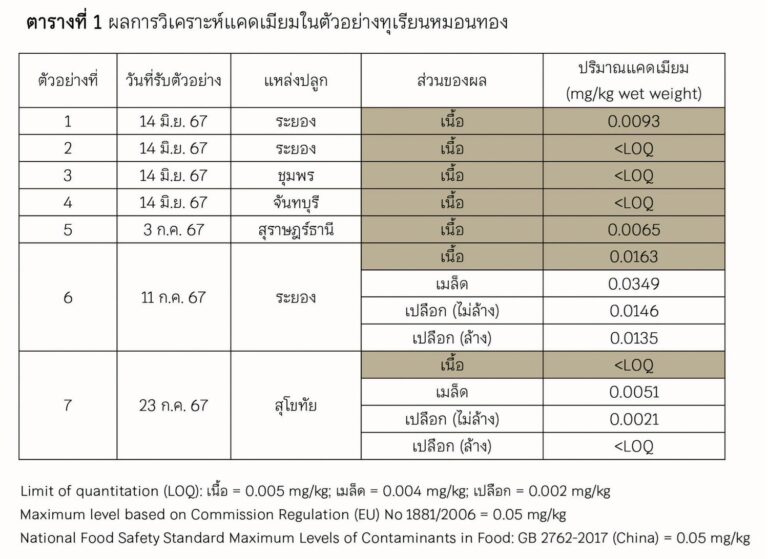ทางสถาบันฯ ยินดีให้บริการตรวจวิเคราะห์ปริมาณ “แคดเมียม” ในทุเรียนไทยแก่ผู้ส่งออกทุเรียน หรือเกษตรกรที่ต้องการตรวจ สามารถติดต่อได้ที่แผนกปฏิบัติการวิเคราะห์ (คุณเนตรทราย โทรศัพท์ 02-553 8555 ต่อ 8620; email: [email protected] หรือคุณปิยพล โทรศัพท์ 02-553 8555 ต่อ 8570 หรือ 089-449 9290; email: [email protected])