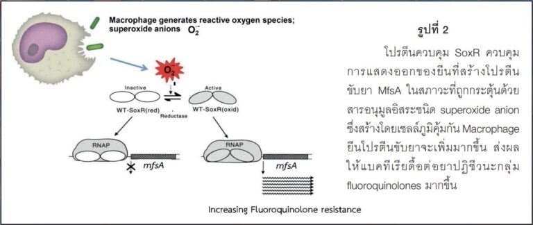 จากการศึกษาทำให้ค้นพบลักษณะที่น่าสนใจของยีน mfsA โดยพบว่า การแสดงออก (expression) ของยีน mfsA จะเพิ่มขึ้นอย่างมากเมื่อเชื้อสัมผัสกับอนุมูลอิสระออกซิเจนชนิดซุปเปอร์ออกไซด์แอนไอออน (superoxide anion) เนื่องจากยีน mfsA ถูกควบคุมโดยโปรตีนควบคุม (transcriptional regulator) ที่ชื่อว่า SoxR  (4) รูปที่ 2 แสดงให้เห็นว่าเมื่อ S. maltophilia สัมผัสกับซุปเปอร์ออกไซด์แอนไอออน ที่สร้างโดยเซลล์เม็ดเลือดขาวในกลุ่มแมคโครฟาจ (macrophage) ในระบบภูมิคุ้มกันชนิดทั่วไป (innate immunity) ทำให้โปรตีนควบคุม SoxR กระตุ้นการสร้างโปรตีนขับยา MfsA เพิ่มมากขึ้น อันเป็นสาเหตุให้เชื้อดื้อต่อยาปฏิชีวนะกลุ่มฟลูออโรควิโนโลน (fluoroquinolones) มากขึ้น การค้นพบนี้มีความน่าสนใจเนื่องจากยากำจัดวัชพืชพาราควอท ก็จัดอยู่ในประเภทสารที่ทำให้เกิดซุปเปอร์ออกไซด์แอนไอออนในเซลล์ได้เช่นกัน เมื่อวิเคราะห์ข้อมูลจากฐานข้อมูลทางจีโนม (National Center for Biotechnology Information – NCBI) พบว่าเชื้อ S. maltophilia ทุกสายพันธุ์มียีน mfsA  ดังนั้น โปรตีนขับยา MfsA จึงเหมาะสมที่จะเป็นเป้าหมายตามสมมุติฐานที่ตั้งไว้ คือ ถ้าสามารถคัดเลือกสารที่สามารถยับยั้งการทำงานของโปรตีนขับยา MfsA ได้ เมื่อนำสารดังกล่าวมาใช้จะทำให้เชื้อแบคทีเรียกลับมาไวต่อยาปฏิชีวนะฟลูออโรควิโนโลน (fluoroquinolones) ได้เช่นเดิม ดังนั้น องค์ความรู้ที่ได้จากงานวิจัยนี้นับเป็นประโยชน์อย่างยิ่งในการพัฒนายาตัวใหม่สำหรับรักษาโรคติดเชื้อได้ในอนาคต