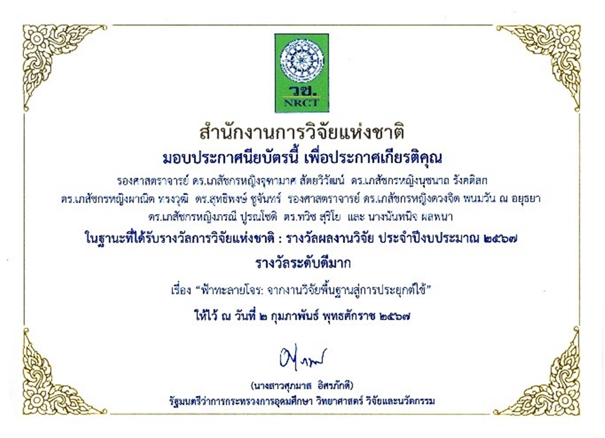 นอกจากนี้ ผลงานวิจัยเรื่อง “ฟ้าทะลายโจร: จากงานวิจัยพื้นฐานสู่การประยุกต์ใช้” ของคณะผู้วิจัยจากสถาบันวิจัยจุฬาภรณ์ ได้รับรางวัลผลงานวิจัยแห่งชาติ ประจำปีงบประมาณ พ.ศ. 2567 ในระดับ “ดีมาก” จากสำนักงานการวิจัยแห่งชาติ (วช.) โดยเข้ารับพระราชทานเกียรติบัตรจาก สมเด็จพระกนิษฐาธิราชเจ้า กรมสมเด็จพระเทพรัตนราชสุดาฯ สยามบรมราชกุมารี เมื่อวันที่ 2 กุมภาพันธ์ 2567