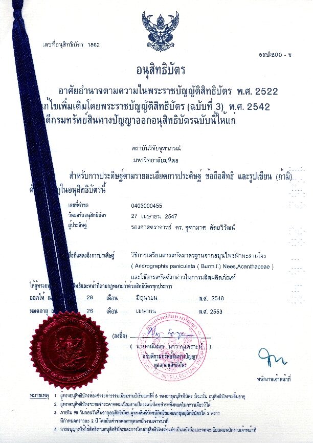 สถาบันวิจัยจุฬาภรณ์ มีการตรวจสอบและควบคุมปริมาณของสารสำคัญทั้งในวัตถุดิบฟ้าทะลายโจรก่อนนำมาใช้ในการเตรียมสารสกัดน้ำและหลังจากได้สารสกัดเป็นผงแห้งแล้ว และได้ยื่นจดอนุสิทธิบัตรครั้งแรก เรื่อง “วิธีการเตรียมสารสกัดมาตรฐานจากสมุนไพรฟ้าทะลายโจร (Andrographis paniculata (Burm.f.) Nees, Acanthaceae)และใช้สารสกัดดังกล่าวในการผลิตผลิตภัณฑ์” เมื่อวันที่ 27 เมษายน 2547
