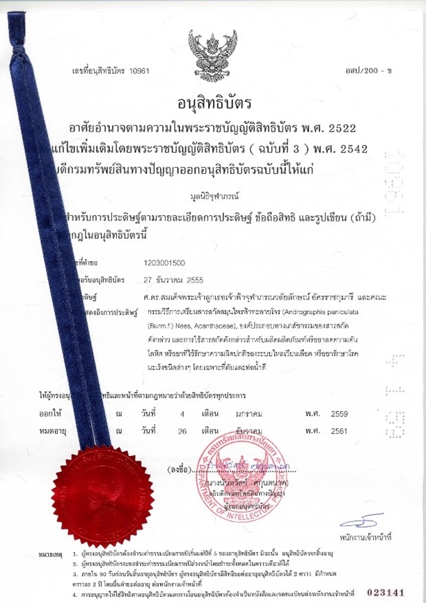 ต่อมา ได้ทำการยื่นจดอนุสิทธิบัตรอีก 1 เรื่อง คือ “กรรมวิธีการเตรียมสารสกัดสมุนไพรฟ้าทะลายโจร (Andrographis paniculata (Burm.f.) Nees, Acanthaceae), องค์ประกอบทางเภสัชกรรมของสารสกัดดังกล่าว และการใช้สารสกัดดังกล่าวสำหรับผลิตผลิตภัณฑ์หรือยาลดความดันโลหิต หรือยาที่ใช้รักษาความผิดปกติของระบบไหลเวียนเลือด หรือยารักษาโรคมะเร็งชนิดต่าง ๆ โดยเฉพาะที่ตับและท่อน้ำดี” เมื่อวันที่ 27 ธันวาคม 2555