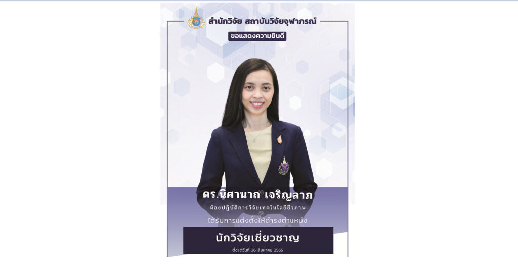 สำนักวิจัย สถาบันวิจัยจุฬาภรณ์ ขอแสดงความยินดีกับศาสตราจารย์ ดร. พัฒนา ศรีฟ้า นักวิจัยเชี่ยวชาญพิเศษ ห้องปฏิบัติการวิจัยเทคโนโลยีชีวภาพ เนื่องในโอกาสได้รับอนุมัติให้ดำรงตำแหน่ง “ศาสตราจารย์เกียรติคุณ” สาขาวิชา พันธุศาสตร...