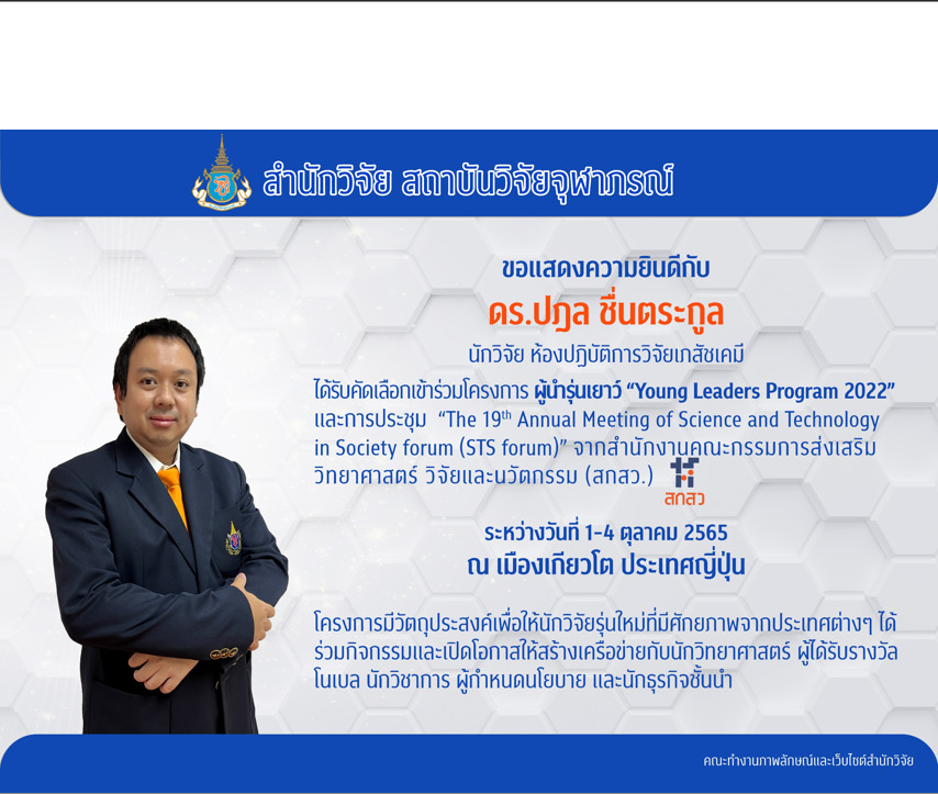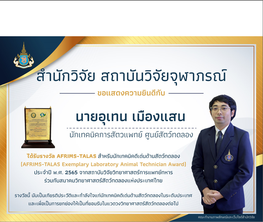 สำนักวิจัย สถาบันวิจัยจุฬาภรณ์ ขอแสดงความยินดีกับศาสตราจารย์เกียรติคุณ ดร.ศกรณ์ มงคลสุข ผู้อำนวยการห้องปฏิบัติการวิจัยเทคโนโลยีชีวภาพ ในโอกาสได้รับพระราชทานปริญญาวิทยาศาสตร์ดุษฎีบัณฑิตกิตติมศักดิ์ สาขาวิชาเทคโนโล...