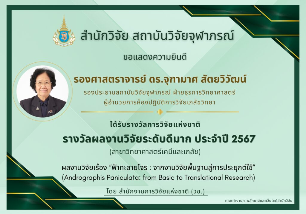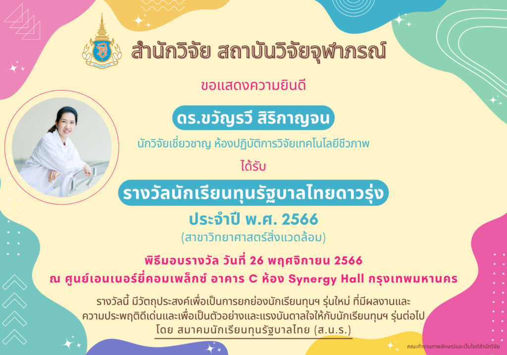 เมื่อวันที่ 22 กันยายน 2568 ดร.ปิยฉัฎร ช่วยสีนวล นักวิจัยเชี่ยวชาญห้องปฏิบัติการวิจัยอินทรีย์เคมีสังเคราะห์ สถาบันวิจัยจุฬาภรณ์ และศิษย์เก่า PPC รุ่น 10 ได้รับรางวัลศิษย์เก่าดีเด่น ด้านผลงานเด่น (Outstanding Achievement ...