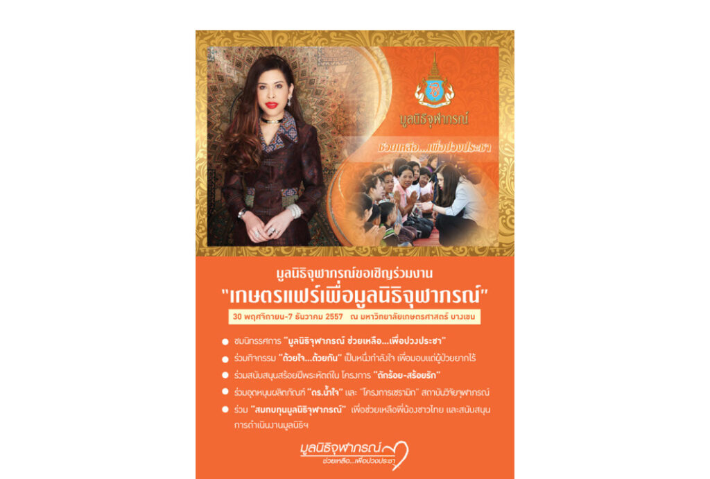 มูลนิธิจุฬาภรณ์ จัดนิทรรศการ “มูลนิธิจุฬาภรณ์ ช่วยเหลือ…เพื่อปวงประชา” ในงานเกษตรแฟร์เพื่อมูลนิธิจุฬาภรณ์ ระหว่างวันที่ 30 พฤศจิกายน – 7 ธันวาคม 2557 ณ มหาวิทยาลัยเกษตรศาสตร์ บางเขน เพื่อเผยแพร่ภารกิจการดำเนินงานและกิจกร...