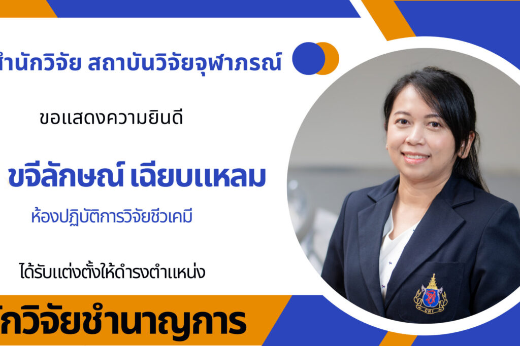 สำนักวิจัย สถาบันวิจัยจุฬาภรณ์ ขอแสดงความยินดีกับ นางสาวขจีลักษณ์ เฉียบแหลม ได้รับการแต่งตั้งตำแหน่งวิชาการ เป็น นักวิจัยชำนาญการ ห้องปฏิบัติการวิจัยชีวเคมี ตั้งแต่วันที่ 26 เมษายน 2567