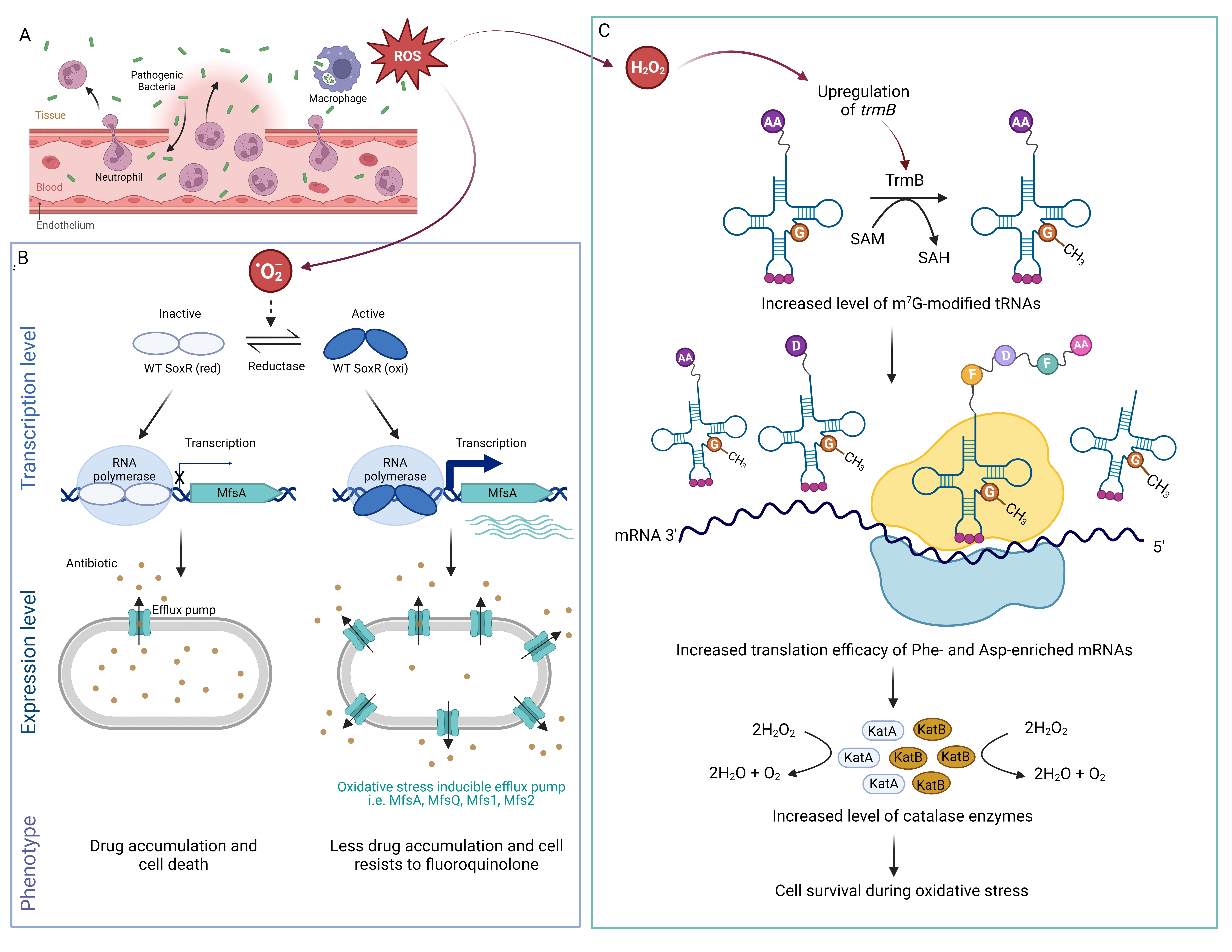 ห้องปฏิบัติการฯ ได้ศึกษากลไกการดื้อต่อยาปฏิชีวนะในเชื้อแบคทีเรียโดยใช้เทคนิคทางด้านพันธุศาสตร์โมเลกุล เพื่อหายีนที่มีความสำคัญในกระบวนการการดื้อต่อยาปฏิชีวนะ โดยผลของงานวิจัยได้มีความเป็นไปได้ที่จะสามารถนำยีนที่ศึกษาเป็นพัฒนาเป็นยีนเป้าหมายของยาชนิดใหม่ๆ ที่ใช้รักษาการติดเชื้อของแบคทีเรียที่ดื้อต่อยาปฏิชีวนะได้ ทางห้องปฏิบัติการฯ ได้ค้นพบและทำการศึกษา MfsA และ MfsQ ใน S. maltophilia ซึ่งเป็นยีนที่ผลิตโปรตีนขับยา และมีความสำคัญต่อกลในการดื้อต่อยาปฏิชีวนะหลายกลุ่มในเชื้อแบคทีเรีย MfsA เป็นโปรตีนขับยาที่สามารถขับยาปฏิชีวนะได้หลายชนิดโดยมีความจำเพาะต่อกลุ่มฟลูออโรควิโนโลน (ภาพ B) MfsQ เป็นโปรตีนขับยาฆ่าเชื้อในกลุ่มแอมโมเนียมจตุตถภูมิ หรือ ควอเตอร์นารีแอมโมเนียม (Quaternary ammonium) ซึ่งเป็นกลุ่มของสารเคมีที่ใช้ในสารฆ่าเชื้ออย่างแพร่หลาย อีกทั้งห้องปฏิบัติการฯ ยังได้ศึกษาโปรตีนขับยา Mfs1 และ Mfs2 ใน P. aeruginosa ซึ่งพบว่าการเพิ่มจำนวนของโปรตีนขับยา Mfs1 และ Mfs2 มีความสัมพันธ์กับการดื้อต่อยาปฏิชีวนะในกลุ่ม อะมิโนไกลโคไซด์ ควิโนโลน และ เซฟาโลสปอริน การศึกษากลไกการดื้อยาพบว่าการเพิ่มปริมาณของ Mfs1 และ Mfs2 ไปกระตุ้นการจับกันของโปรตีน ArmZ และ MexZ ส่งผลให้ปริมาณของโปรตีนขับยา MexXY ซึ่งเป็นโปรตีนขับยาชนิด RND มีจำนวนเพิ่มสูงขึ้น ทำให้เชื้อแบคทีเรียดื้อต่อยาปฏิชีวนะมากขึ้น เมื่อบูรณาการองค์ความรู้ที่ได้จากการศึกษาและค้นพบเกี่ยวกับความสำคัญและความเชื่อมโยงของ ยีน โปรตีน และการดื้อต่อยาปฏิชีวนะในเชื้อแบคทีเรียเหล่านี้ การพัฒนายามีความจำเพาะต่อยีน หรือโปรตีนเพื่อแก้ไขการดื้อต่อยาปฏิชีวนะจึงมีความเป็นไปได้