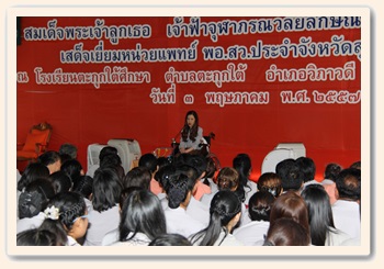 เมื่อวันเสาร์ที่ 3 พฤษภาคม พุทธศักราช 2557 สมเด็จพระเจ้าลูกเธอ เจ้าฟ้าจุฬาภรณวลัยลักษณ์ อัครราชกุมารี เสด็จไปยังโรงเรียน ตะกุกใต้ศึกษา บ้านไร่ยาว ตำบลตะกุกใต้ อำเภอวิภาวดี จังหวัดสุราษฎร์ธานี ทรงเยี่ยมราษฎรและหน่วยแพทย์อาสาสมเด็จพระศรีนครินทราบรมราชชนนี (พอ.สว.) เพื่อพระราชทานขวัญและกำลังใจ แก่เจ้าหน้าที่และสมาชิก พอ.สว. ที่ออกปฏิบัติงานหน่วยแพทย์เคลื่อนที่ตรวจรักษาอาการเจ็บป่วยของราษฎร และให้คำปรึกษาเกี่ยวกับสัตว์เลี้ยง นอกจากนี้ ยังได้นำยาสามัญประจำบ้าน เครื่องนุ่งห่ม และเครื่องแบบนักเรียนไปแจกจ่ายแก่ผู้สูงอายุ และเด็กนักเรียนในพื้นที่ด้วย