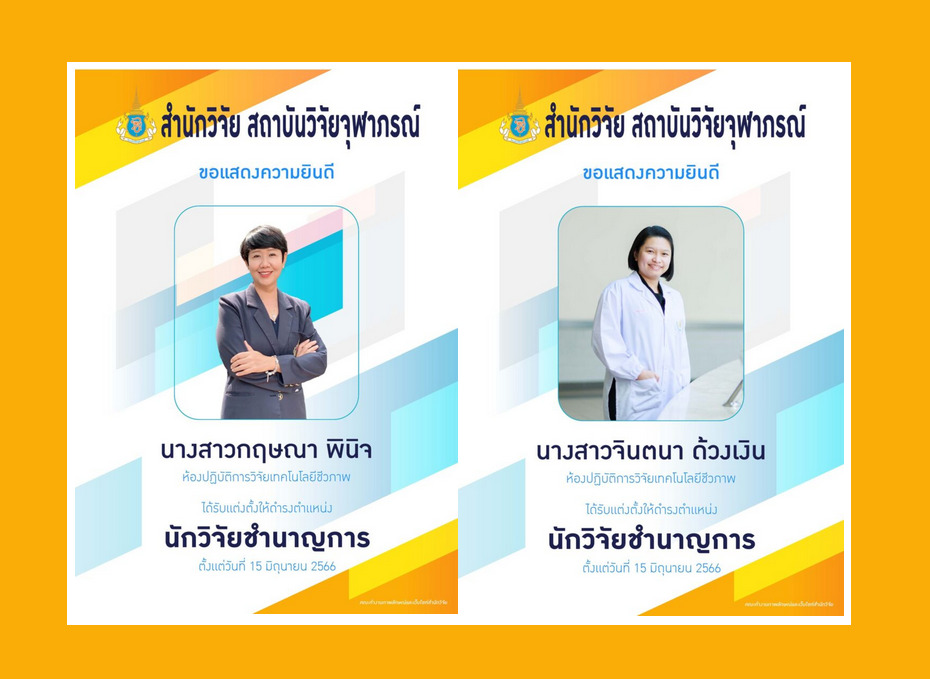 สำนักวิจัย สถาบันวิจัยจุฬาภรณ์ ขอแสดงความยินดีกับนักวิจัยที่ได้รับแต่งตั้งตำแหน่งวิชาการ ได้แก่ ดร.ศานิตย์ ทองเนตร เป็น นักวิจัยเชี่ยวชาญ ดร.ชูรัฐ วีระพันธุ์ เป็น นักวิจัยชำนาญการ ดร.เพ็ญฉัตร ดิศกุล ณ อยุธยา เป็น นักว...