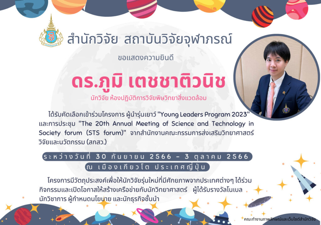 สำนักวิจัย สถาบันวิจัยจุฬาภรณ์ ขอแสดงความยินดีกับ ดร.ภูมิ เตชชาติวนิช นักวิจัย ห้องปฏิบัติการวิจัยพิษวิทยาสิ่งแวดล้อม ได้รับคัดเลือกเข้าร่วมโครงการผู้นำรุ่นเยาว์ “Young Leaders Program 2023” และการประชุม “The 20th Annual Meeting of Science and Technology in Society Forum (STS Forum)” จากสำนักงานคณะกรรมการส่งเสริมวิทยาศาสตร์ วิจัยและนวัตกรรม (สกสว.) ระหว่างวันที่ 30 กันยายน 2566 – 3 ตุลาคม 2566 ณ เมืองเกียวโต ประเทศญี่ปุ่น