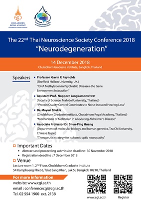 สถาบันบัณฑิตศึกษาจุฬาภรณ์ ราชวิทยาลัยจุฬาภรณ์ ร่วมกับสมาคมประสาทวิทยาศาสตร์ไทย จัดประชุมวิชาการประสาทวิทยาศาสตร์ ครั้งที่ 22 ประจำปี 2561 เรื่อง “Neurodegeneration” (22nd Thai Neuroscience Society Conference 2018)