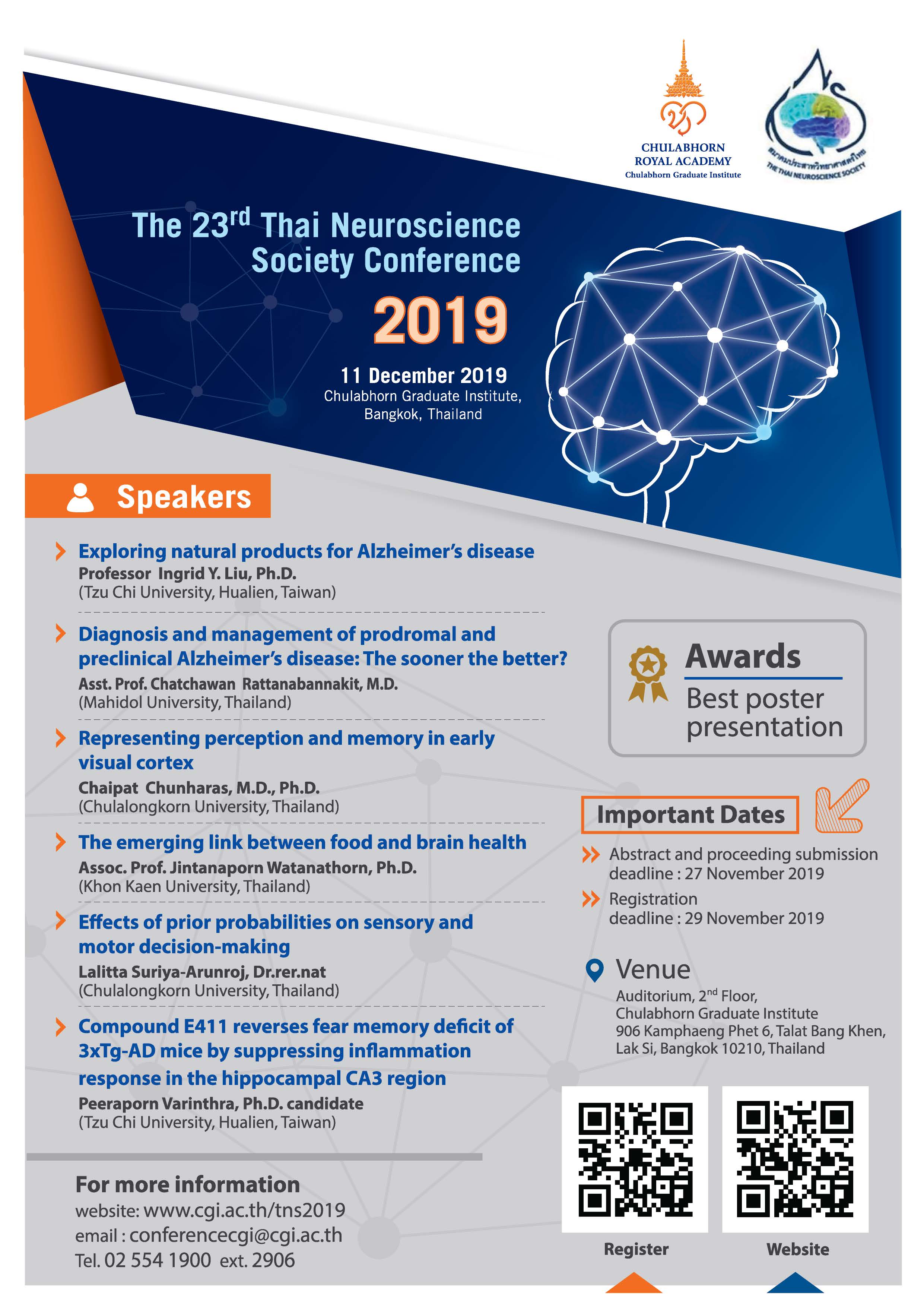 สถาบันบัณฑิตศึกษาจุฬาภรณ์ ราชวิทยาลัยจุฬาภรณ์ ร่วมกับสมาคมประสาทวิทยาศาสตร์ไทย กำหนดจัดประชุมวิชาการประสาทวิทยาศาสตร์ ครั้งที่ 23 ประจำปี 2562 (The 23rd Thai Neuroscience Society Conference 2019) ในวันพุธที่ 11 ธันวาคม 2562 เวลา 08.30 – 17.00 ณ ห้องประชุมใหญ่ ชั้น 2 อาคารสถาบันบัณฑิตศึกษาจุฬาภรณ์