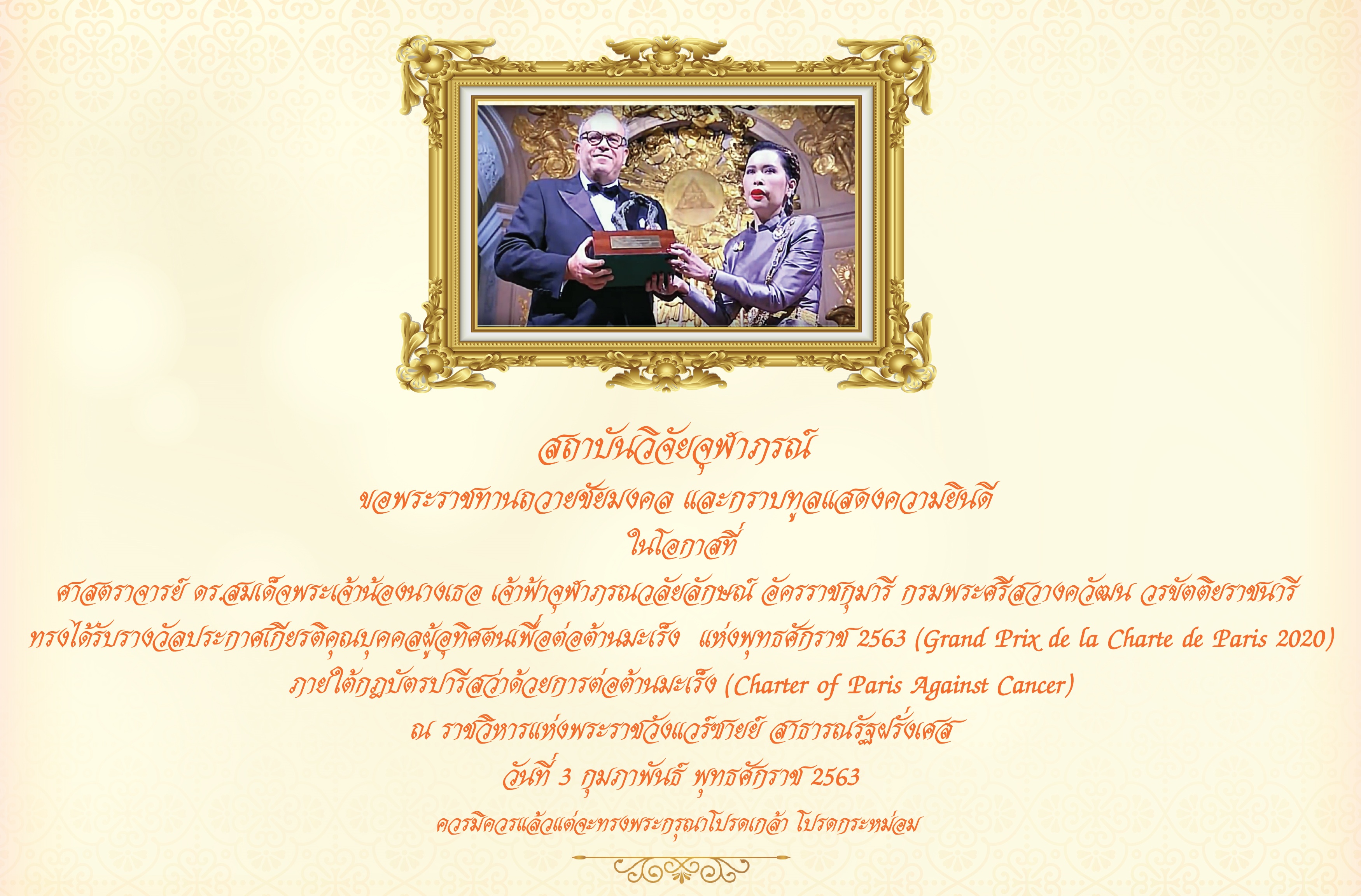 สถาบันวิจัยจุฬาภรณ์ ขอพระราชทานถวายชัยมงคล และกราบทูลแสดงความยินดี ในโอกาสที่ ทรงได้รับรางวัลฯ