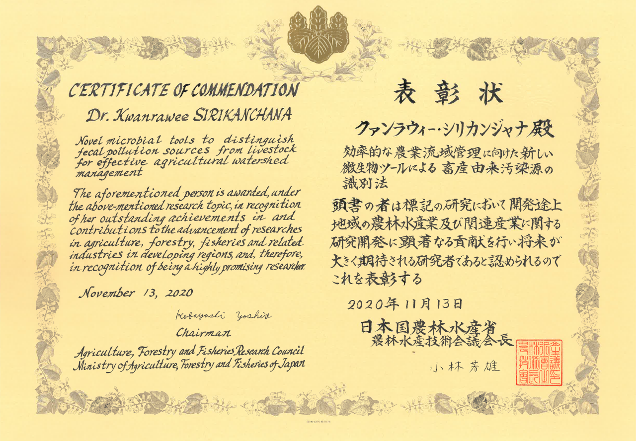 ดร.ขวัญรวี สิริกาญจน นักวิจัยเชี่ยวชาญประจำห้องปฏิบัติการวิจัยเทคโนโลยีชีวภาพ ได้รับรางวัล Japan International Award 2020 for Young Agricultural Researchers (Japan Award) จาก the Ministry of Agriculture, Forestry and Fisheries (MAFF) ประเทศญี่ปุ่น ในหัวข้อวิจัยเรื่อง “Novel microbial tools to distinguish fecal pollution sources from livestock for effective agricultural watershed management” รางวัลวิจัยนี้ มีวัตถุประสงค์เพื่อสนับสนุนงานวิจัยด้านการเกษตร ป่าไม้ และการประมง โดยคัดเลือกจากนักวิจัยรุ่นใหม่จากประเทศกำลังพัฒนา
