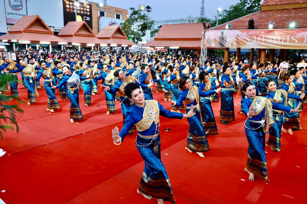 จากนั้น ทอดพระเนตรการแสดงรำบวงสรวงท้าวสุรนารี โดย สตรีชาวจังหวัดนครราชสีมา จากหลายภาคส่วน ที่พร้อมใจกันแต่งชุดไทยบรมพิมานสีน้ำเงิน คาดสไบทอง โดยใช้กระบวนท่ารำในรูปแบบนาฏศิลป์ไทยมาตรฐาน พร้อมทั้งนำทำนองเพลงและเนื้อร้องมาผสมกับดนตรีมโหรีโคราช อันเป็นเอกลักษณ์ท้องถิ่นและศิลปะพื้นบ้าน