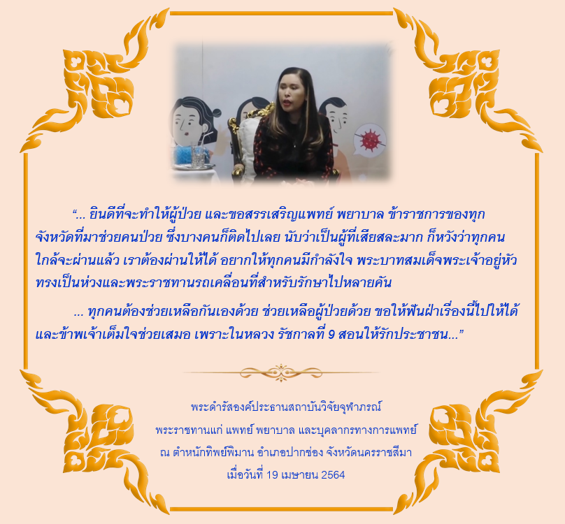 ด้วยความซาบซึ้งในน้ำพระทัย และสำนึกในพระกรุณาธิคุณล้นเกล้าล้นกระหม่อมอันหาที่สุดมิได้ ที่ ศาสตราจารย์ ดร.สมเด็จพระเจ้าน้องนางเธอ เจ้าฟ้าจุฬาภรณวลัยลักษณ์ อัครราชกุมารี กรมพระศรีสวางควัฒน วรขัตติยราชนารี องค์ประธานสถาบันวิจัยจุฬาภรณ์ ทรงมีความห่วงใยแพทย์ พยาบาล และบุคลากรทางการแพทย์ผู้เสียสละ ท่ามกลางวิกฤตการแพร่ระบาดของเชื้อไวรัสโคโรนาสายพันธุ์ใหม่ (โควิด-19) อยู่ในขณะนี้