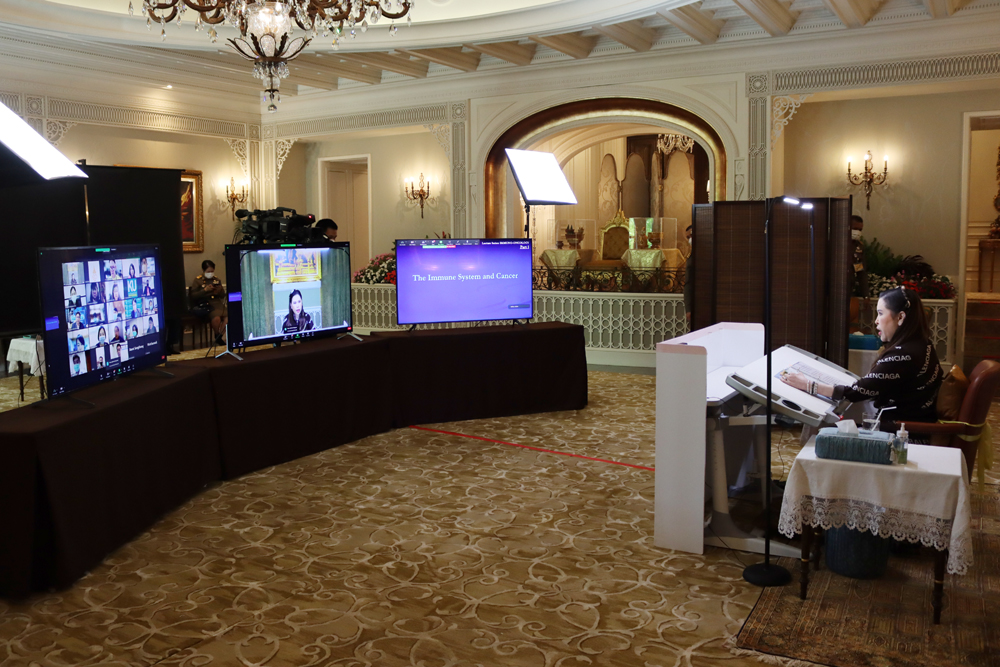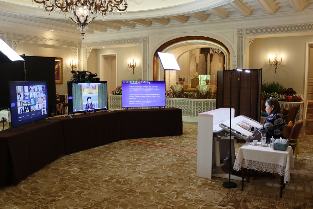 ศาสตราจารย์ ดร.สมเด็จพระเจ้าน้องนางเธอ เจ้าฟ้าจุฬาภรณวลัยลักษณ์ อัครราชกุมารี กรมพระศรีสวางควัฒน วรขัตติยราชนารี ทรงบรรยายพิเศษผ่านสื่ออิเล็กทรอนิกส์ (ออนไลน์) เรื่อง “ภูมิคุ้มกันบำบัดมะเร็ง (Immuno-oncology)” พระราชทานแก่ คณาจารย์ และนิสิต คณะสัตวแพทยศาสตร์ คณะวิทยาศาสตร์ และบัณฑิตวิทยาลัย มหาวิทยาลัยเกษตรศาสตร์ วันที่ 18 – 19 มกราคม 2565 ณ ท้องพระโรง ตำหนักทิพย์พิมาน ตำบลโป่งตาลอง อำเภอปากช่อง จังหวัดนครราชสีมา