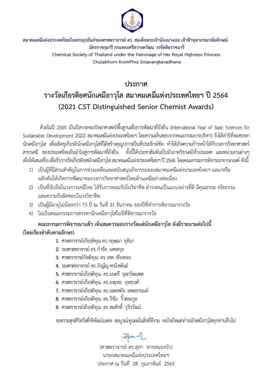 สำนักวิจัย สถาบันวิจัยจุฬาภรณ์ ร่วมแสดงความยินดีในโอกาสที่ศาสตราจารย์เกียรติคุณ ดร.สมศักดิ์ รุจิรวัฒน์ รองประธานสถาบันวิจัยจุฬาภรณ์ ฝ่ายวิจัย และผู้อำนวยการห้องปฏิบัติการวิจัยเภสัชเคมี ได้รับรางวัลเกียรติยศนักเคมีอาวุโส สมาคมเคมีแห่งประเทศไทยในพระอุปถัมภ์ของ ศาสตราจารย์ ดร.สมเด็จพระเจ้าน้องนางเธอ เจ้าฟ้าจุฬาภรณวลัยลักษณ์ อัครราชกุมารี กรมพระศรีสวางควัฒน วรขัตติยราชนารี ปี 2564 (2021 CST DISTINGUISHED SENIOR CHEMIST AWARDS) รางวัลเกียรติยศแห่งความภาคภูมิใจเพื่อยกย่องเชิดชูเกียรตินักเคมีอาวุโสที่ได้สร้างคุณูปการเป็นที่ประจักษ์ ทำให้เกิดความก้าวหน้าแก่วงการวิทยาศาสตร์ สาขาเคมีของประเทศไทยอันนำไปสู่การพัฒนาที่ยั่งยืน