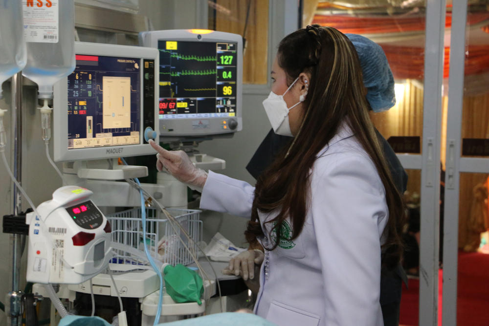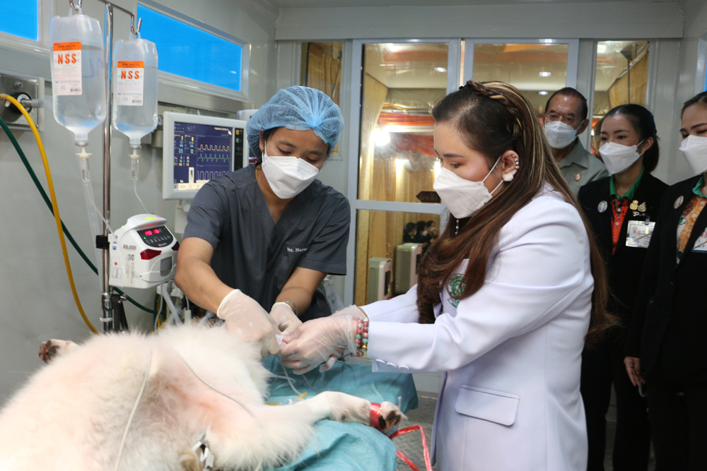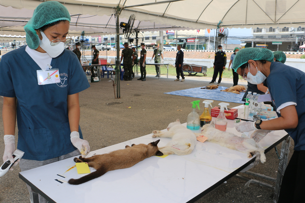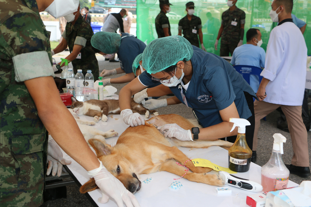 พร้อมกันนี้ ทรงพระดำเนินไปทอดพระเนตรการออกหน่วยสัตวแพทย์อาสาจุฬาภรณ์ และทรงเยี่ยมประชาชนที่นำสัตว์เลี้ยงมารับบริการ จากนั้น ทรงฉีดวัคซีนป้องกันโรคพิษสุนัขบ้าให้แก่สุนัขเพศผู้จำนวน 2 ตัว และทรงร่วมกับทีมสัตวแพทย์อาสาจุฬาภรณ์ ผ่าตัดทำหมันให้กับสุนัข จำนวน 12 ตัว เพื่อควบคุมการขยายพันธุ์ของประชากรสุนัขจรจัดในพื้นที่ ในการนี้ ทรงวางยาสลบให้กับสุนัขแต่ละตัว และทรงติดตามสัญญาณชีพของสุนัข ด้วยพระองค์เองอย่างใกล้ชิด ผ่านจอมอนิเตอร์ที่แสดงผลอัตราการเต้นของหัวใจ อัตราการหายใจ ความดันโลหิตรวมถึงอุณหภูมิของร่างกาย เพื่อทรงประเมินความปลอดภัยของสุนัขระหว่างการผ่าตัด ให้เป็นไปอย่างมีประสิทธิภาพ และเกิดความปลอดภัยสูงสุด