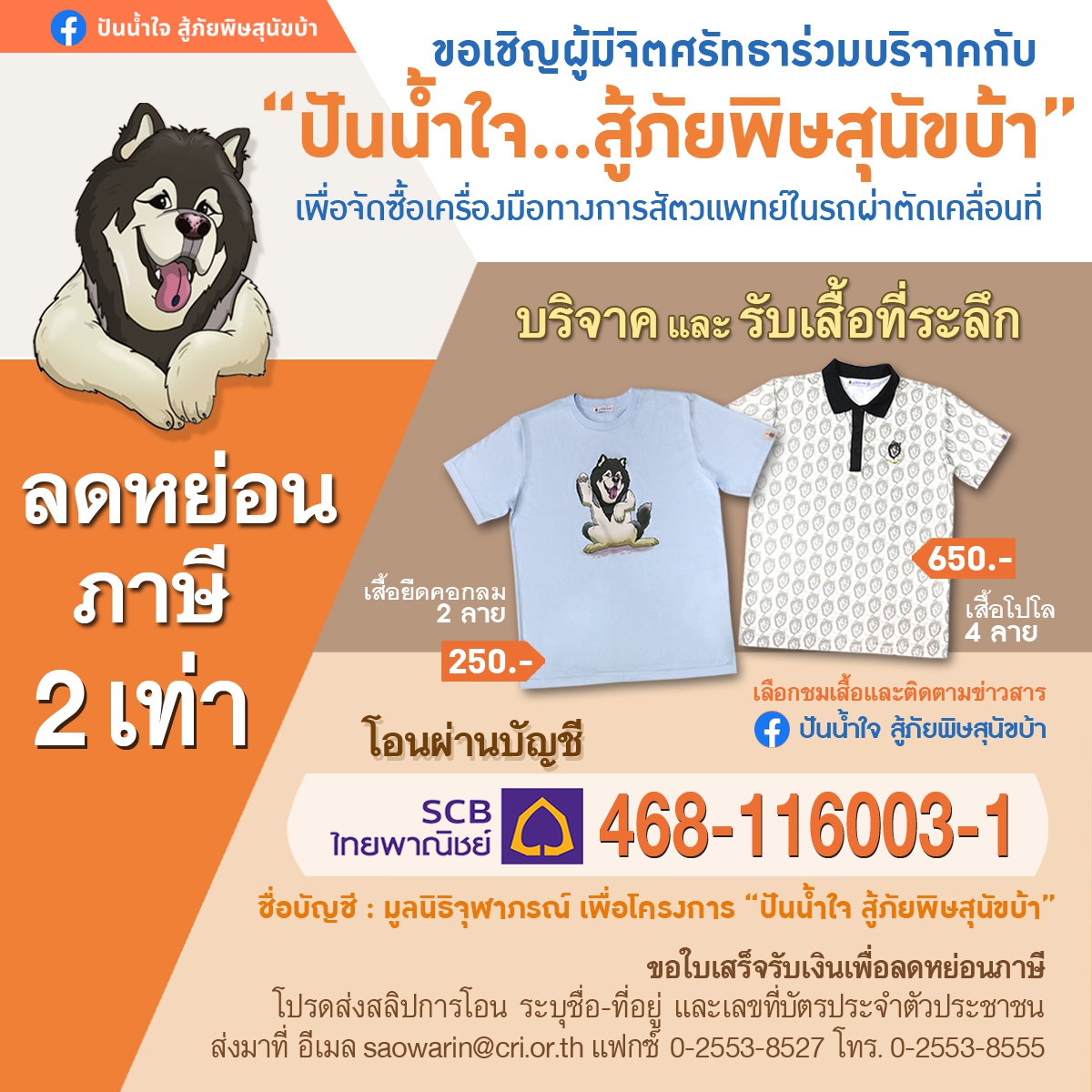 ผู้สนใจยังสามารถร่วมบริจาคได้อย่างต่อเนื่อง เพราะยังมีสุนัข แมว และสัตว์จรจัดไร้ที่พึ่งอีกเป็นจำนวนมาก ที่ยังรอความช่วยเหลืออยู่ มาร่วมกันมอบความรักและส่งต่อความห่วงใย ด้วยการสนับสนุนเสื้อลายภาพวาดฝีพระหัตถ์ฯ สุนัขทรงเลี้ยง “คุณไหมทอง” ซึ่งมีทั้งเสื้อยืดคอกลม มูลค่า 250 บาท และเสื้อโปโล มูลค่า 650 บาท โดยสามารถร่วมบริจาคผ่านบัญชี ธนาคารไทยพาณิชย์ ชื่อบัญชี : มูลนิธิจุฬาภรณ์ เพื่อโครงการ “ปันน้ำใจ สู้ภัยพิษสุนัขบ้า” เลขที่บัญชี : 468-116003-1 และส่งหลักฐานการโอนมาที่ e-mail : [email protected] โทรสาร 0-2553-8527 หรือ มูลนิธิจุฬาภรณ์ โทร.0-2553-8555 (เงินบริจาคสามารถนำไปลดหย่อนภาษีได้ 2 เท่า) ติดตามรายละเอียดเพิ่มเติมได้ที่ Facebook : ปันน้ำใจ สู้ภัยพิษสุนัขบ้า