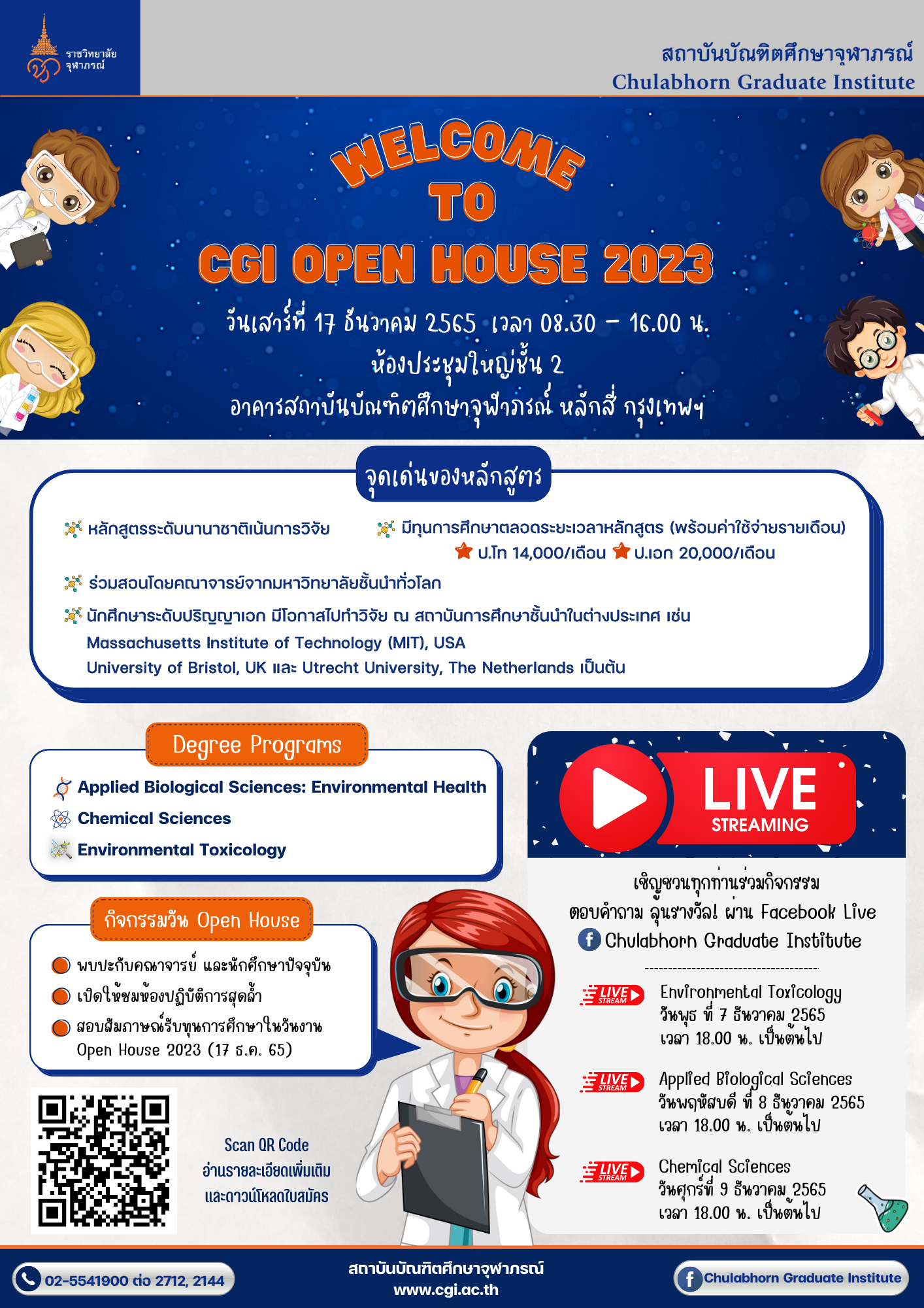 สถาบันบัณฑิตศึกษาจุฬาภรณ์ กำหนดจัด “งานแนะนำหลักสูตร CGI OPEN HOUSE 2023” และสอบคัดเลือกผู้รับทุนการศึกษาตลอดระยะเวลาหลักสูตรพร้อมค่าใช้จ่ายรายเดือน ทั้งนี้ ผู้ที่ได้รับการคัดเลือกให้ทุนยังมีโอกาสได้ฝึกงานวิจัย ณ มหาวิทยาลัยและสถาบันวิจัยชั้นนำที่สหรัฐอเมริกาอีกด้วย สำหรับงาน CGI Open House จะจัดขึ้น ในวันเสาร์ที่ 17 ธันวาคม 2565 เวลา 09:00-14:00 น. ณ อาคารสถาบันบัณฑิตศึกษาจุฬาภรณ์ โดยกิจกรรมในงานประกอบด้วยนิทรรศการแสดงผลงานวิจัยของคณาจารย์และนักศึกษา การเยี่ยมชมห้องปฏิบัติการวิทยาศาสตร์ที่เพียบพร้อมด้วยเครื่องมืออันทันสมัย นอกจากนี้ ยังได้ร่วมลุ้นรางวัล ผ่าน Facebook Live “Chulabhorn Graduate Institute” ในวันที่ 7-9 ธันวาคม 2565 ช่วงเวลา 18:00 น. เป็นต้นไป