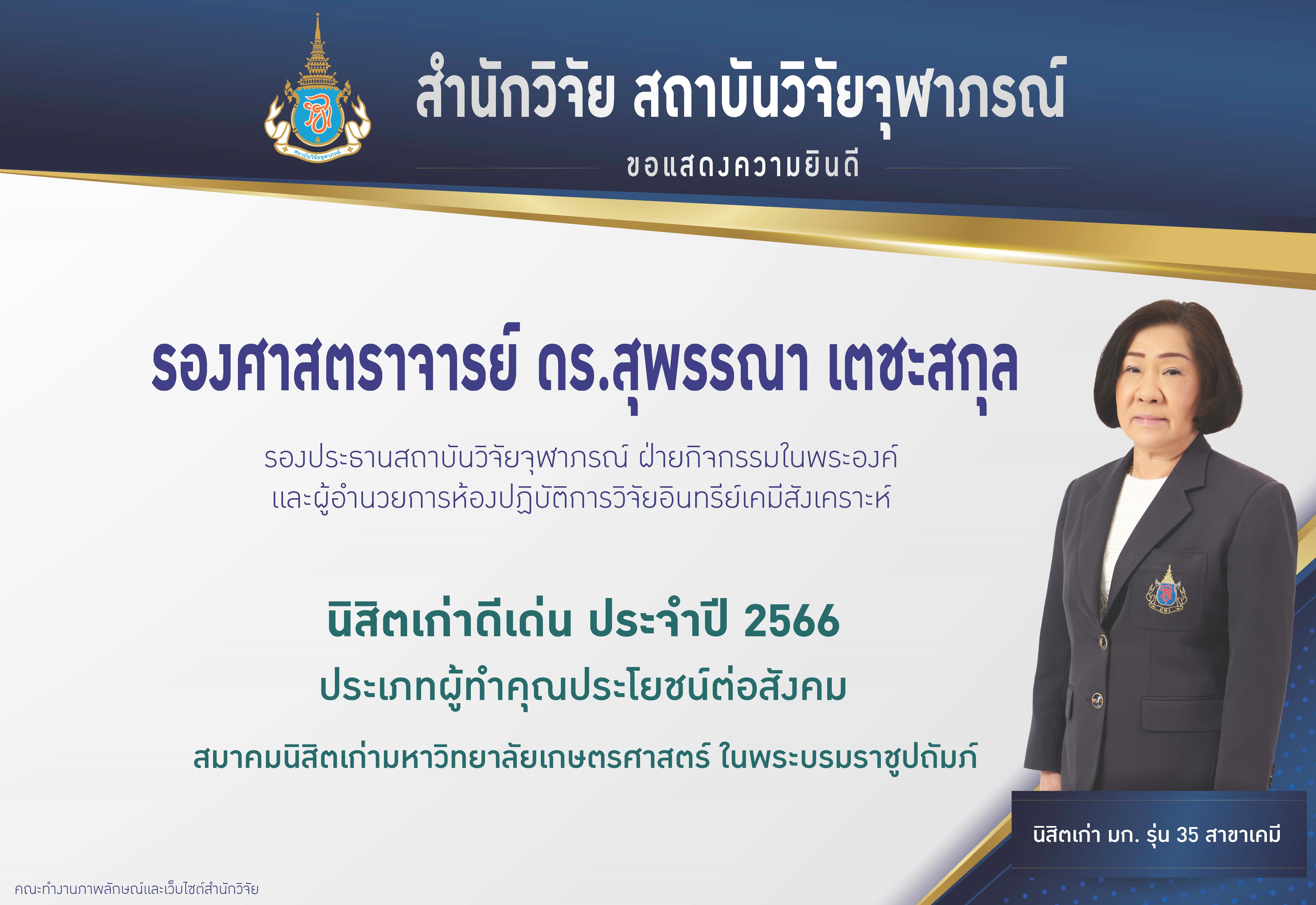 สำนักวิจัย สถาบันวิจัยจุฬาภรณ์ ขอแสดงความยินดีกับรองศาสตราจารย์ ดร.สุพรรณา เตชะสกุล รองประธานสถาบันวิจัยจุฬาภรณ์ ฝ่ายกิจกรรมในพระองค์ และผู้อำนวยการห้องปฏิบัติการวิจัยอินทรีย์เคมีสังเคราะห์ และศาสตราจารย์ ดร.พัฒนา ศรีฟ้า นักวิจัยเชี่ยวชาญพิเศษ ห้องปฏิบัติการวิจัยเทคโนโลยีชีวภาพ นิสิตเก่าคณะวิทยาศาสตร์ มหาวิทยาลัยเกษตรศาสตร์ ในโอกาสได้รับคัดเลือกเป็น นิสิตเก่าดีเด่นประจำปี 2566 จาก สมาคมนิสิตเก่ามหาวิทยาลัยเกษตรศาสตร์ ในพระบรมราชูปถัมภ์