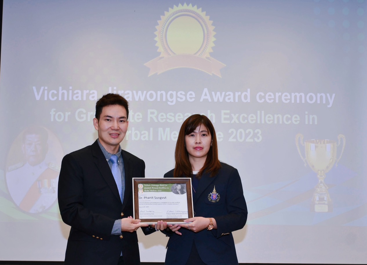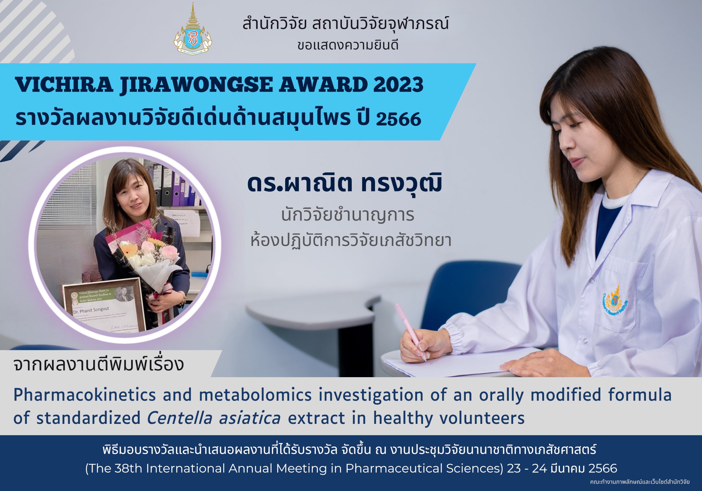 ดร.ผาณิต ทรงวุฒิ นักวิจัยชำนาญการ ห้องปฏิบัติการวิจัยเภสัชวิทยา สถาบันวิจัยจุฬาภรณ์ ได้รับรางวัล ผลงานวิจัยดีเด่นด้านสมุนไพร ประจำปี 2566 (Vichiara Jirawongse Award for Graduate Research Excellence in Herbal Medicine 2023) จากผลงานวิจัยตีพิมพ์เรื่อง “Pharmacokinetics and metabolomics investigation of an orally modified formula of standardized Centella asiatica extract in healthy volunteers” โดยพิธีมอบรางวัล พร้อมกับนำเสนอผลงานวิจัยที่ได้รับรางวัล (oral presentation) จัดขึ้นในงานประชุมวิจัยนานาชาติทางเภสัชศาสตร์ ประจำปี 2566 (The 38th International Annual Meeting in Pharmaceutical Sciences, IAMPS38) ณ โรงแรมปทุมวันปริ๊นเซส ถนนพญาไท แขวงวังใหม่ เขตปทุมวัน กรุงเทพมหานคร ระหว่างวันที่ 23 – 24 มีนาคม 2566