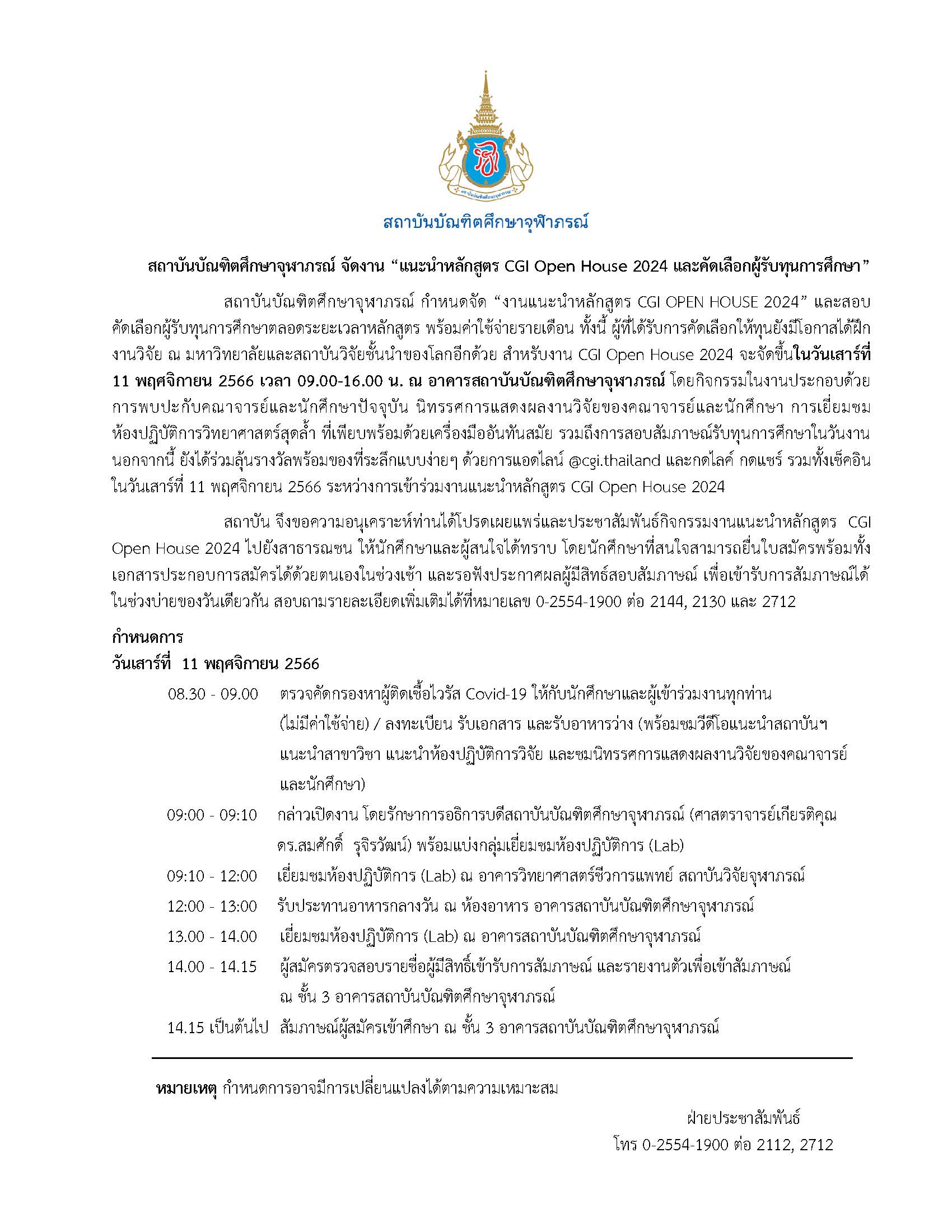 สถาบันบัณฑิตศึกษาจุฬาภรณ์ จัดงาน “แนะนำหลักสูตร CGI Open House 2024 และคัดเลือกผู้รับทุนการศึกษา”
