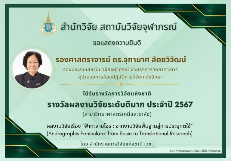 1.1 รางวัลผลงานวิจัย ระดับดีมาก สาขาวิทยาศาสตร์เคมีและเภสัช ผลงานวิจัยเรื่อง ฟ้าทะลายโจร: จากงานวิจัยพื้นฐานสู่การประยุกต์ใช้ (Andrographis Paniculata: from Basic to Translational Research) ของห้องปฏิบัติการวิจัยเภสัชวิทยา โดยมี รองศาสตราจารย์ ดร.จุฑามาศ สัตยวิวัฒน์ เป็นหัวหน้าโครงการ และมีผู้ร่วมงานวิจัยประกอบด้วย ดร.เภสัชกรหญิงนุชนาถ รังคดิลก ดร.เภสัชกรหญิงผาณิต ทรงวุฒิ ดร.สุทธิพงษ์ ชูจันทร์ รองศาสตราจารย์ ดร.ดวงจิตต์ พนมวัน ณ อยุธยา ดร.ภรณี ปูรณโชติ ดร.ทวิช สุริโย และนางนันทนิจ ผลพนา